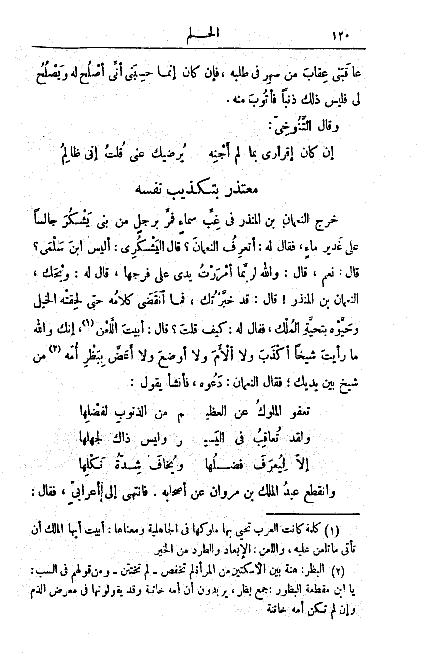 خَرَجَ النُّعمانُ بنُ المنذرِ في غِبِّ سماءٍ فمرَّ بِرَجُلٍ مِنْ بَني يَشْكُرَ جالِساً على غَديرِ ماءٍ، فقال له: أتعْرِفُ النُّعمانَ؟ قال اليَشْكُريُّ: ألَيْسَ ابْنَ سَلْمى؟ قال: نَعَمْ، قال: واللهِ لَرُبَّما أمْرَرْتُ يَدي على فَرْجها، قال له: وَيْحَك، النُّعْمانُ بنُ المُنذر! قال: قَدْ خَبّرْتُك، فَما انْقَضى كلامُه حتَّى لَحِقَتْه الخيلُ وحَيَّوْه بِتَحيَّةِ المُلْكِ، فقال له: كيفَ قلتَ؟ قال: أبَيْتَ اللَّعنَ، إنّك واللهِ ما رأيْتَ شَيْخاً أكذبَ ولا ألأمَ ولا أوْضعَ ولا أعَضَّ بِبَظْرِ أمِّه من سيخٍ بين يديك، فقال النُّعمانُ: دعوه، فأنشأ يقول:
