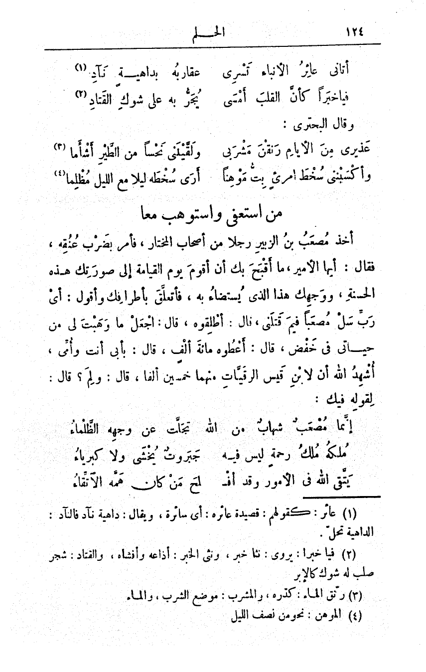أخذ مصعب بنُ الزبير رجلاً من أصْحابِ المختار، فأَمَرَ بِضَرْبِ عُنقِه، فقال: أيّها الأمير، ما أقْبحَ بكَ أنْ أقومَ يوم القيامةِ إلى صورتك هذه الحسنة، ووجْهِك هذا الذي يُستضاء به، فأتعلَّقَ بأطْرافِك وأقول: أي ربِّ سلْ مُصْعَباً فيمَ قتلني، قال: أطلقوه، قال: اجْعلْ ما وَهَبْتَ لي من حياتي في خَفْض، قال: أعطوه مائةَ ألفٍ، قال: بأبي أنت وأمِّي، أشْهدُ اللهَ أن لابن قيس الرقَيَّات منهما خمسينَ ألفا، قال: ولم؟ قال: لقوله فيك:
