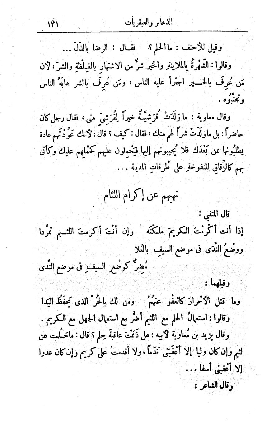وقال يزيد بن معاويةَ لأبيه: هل ذمَمْتَ عاقبةَ حِلْمٍ؟ قال: ما حَلُمْتُ عن لئيمٍ وإنْ كانَ وليّا إلا أعْقَبني نَدماً، ولا أقدمْتُ على كريمٍ وإنْ كانَ عدوَّاً إلا أعْقَبني أسفاً. .