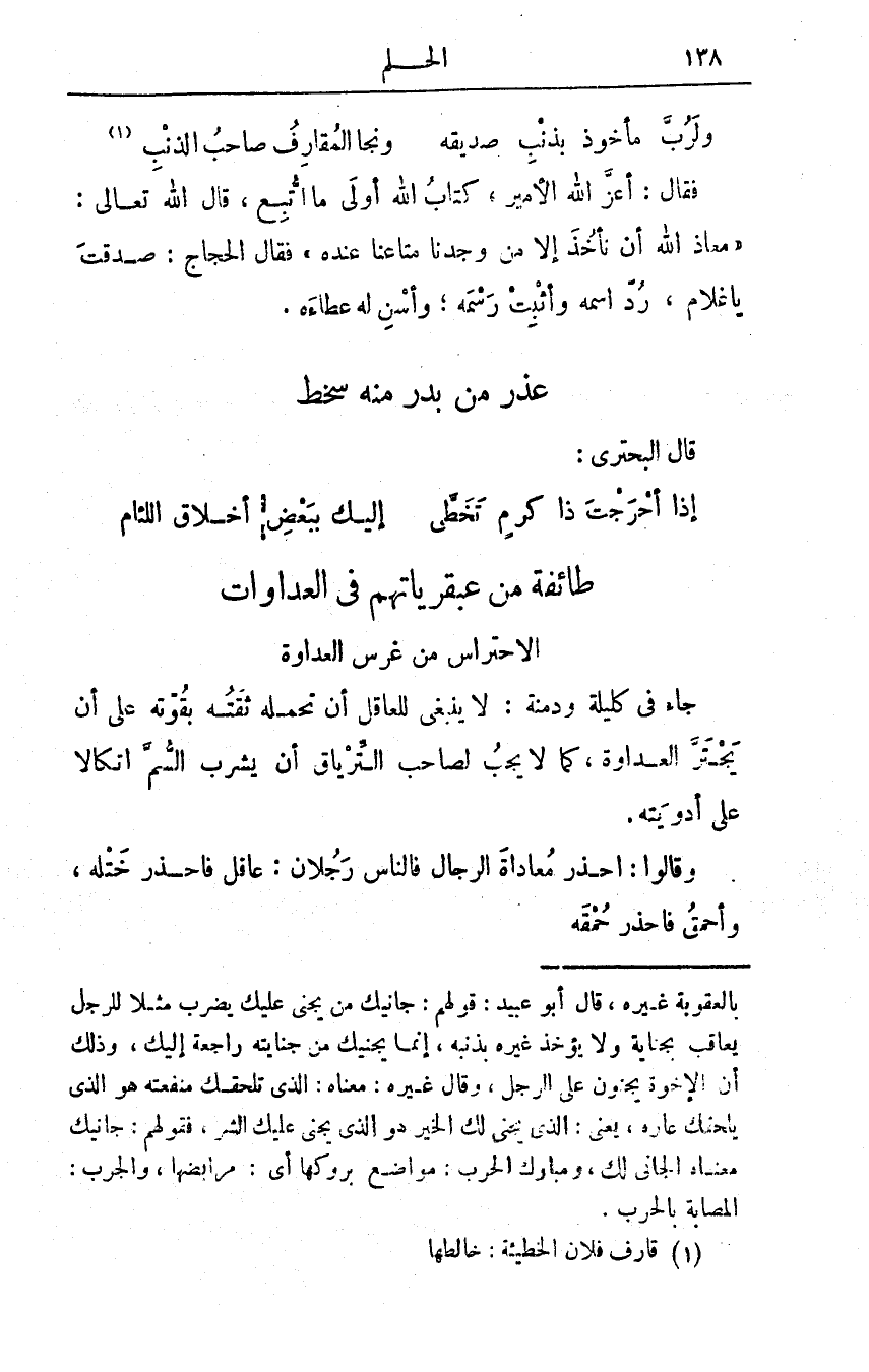 وقالوا: احْذَرْ معاداةَ الرجالِ فالناس رَجُلان: عاقلٌ فاحْذَرْ خَتْلَه، وأحْمَقُ فاحْذَرْ حُمْقَه.