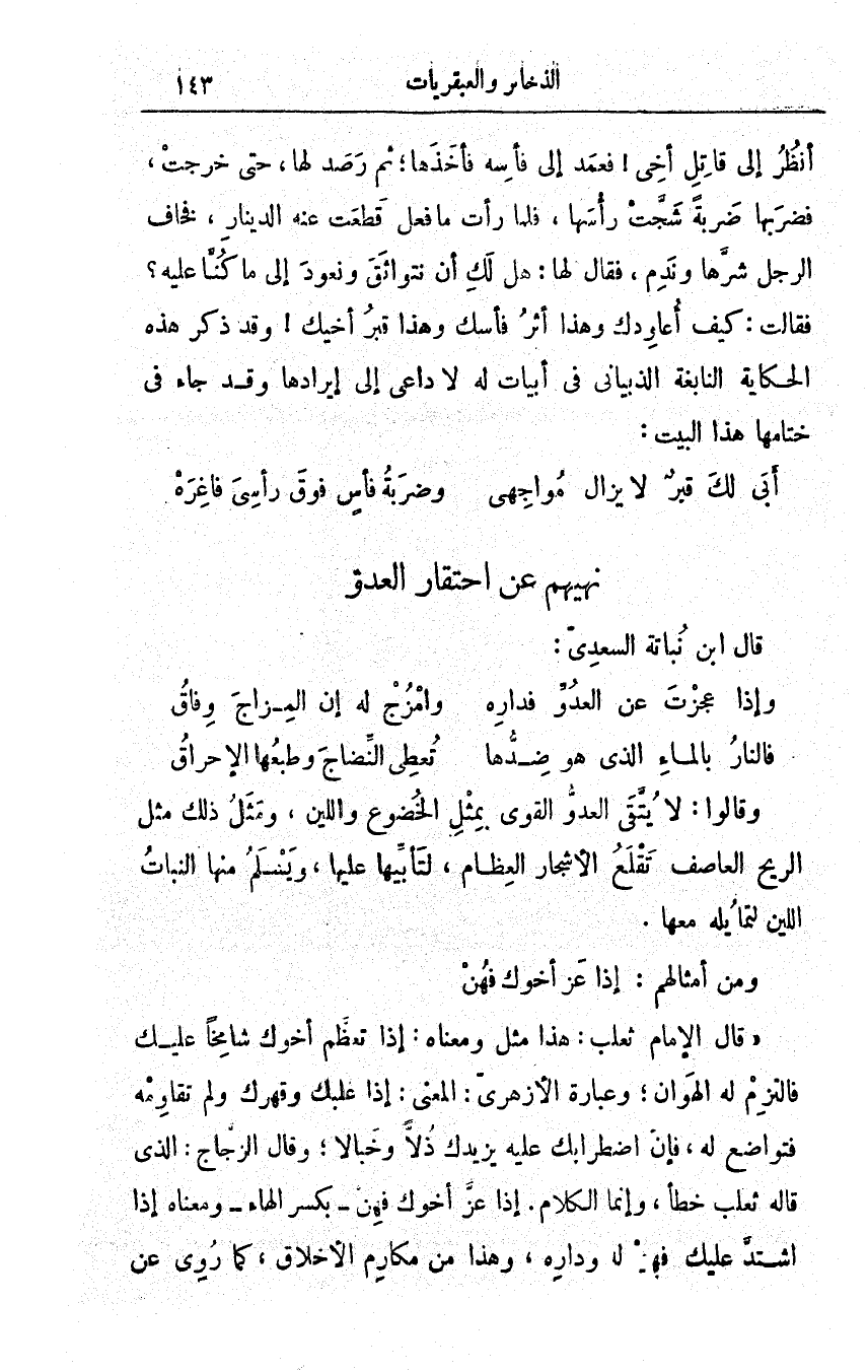 أنظرُ إلى قاتل أخي! فعمَدَ إلى فأسِه فأخَذَها؛ ثم رصدَ لها، حتّى خرجت، فضَربَها ضربةً شجَّت رأسَها، فلما رأت ما فعل قطَعَتْ عنه الدينار، فخاف الرجلُ شرَّها ونَدِمَ، فقال لها: هل لك أن نتواثقَ ونعودَ إلى ما كنَّا عليه؟ فقالت: كيف أعاوِدُك وهذا أثرُ فأسك وهذا قبرُ أخيك! وقد ذكر هذه الحكاية النابغة الذبياني في أبياتٍ له لا داعي إلى إيرادِها وقد جاء في ختامِها هذا البيت: