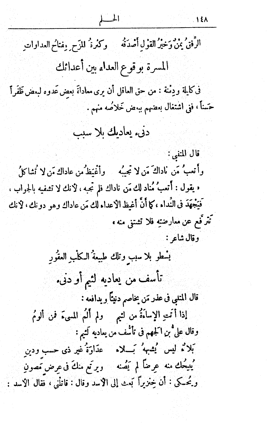 وأتْعَبُ مَنْ ناداكَ مَنْ لا تُجيبُه ... وأغيظُ مَنْ عاداكَ مَنْ لا تُشاكِلُ
