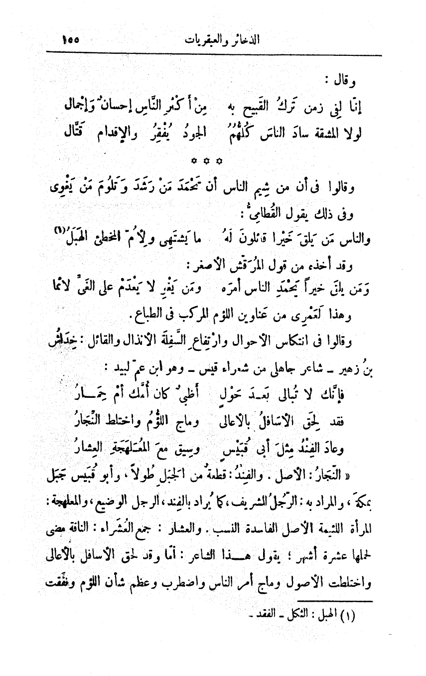 الشريف، كما يُراد بالفِند، الرَّجلُ الوضيع، والمُعَلْهَجة: المرأةُ اللئيمةُ الأصْل الفاسِدةُ النَّسب. والعشار: جمع العُشراء: الناقة مضى لحملها عشرة أشهر؛ يقولُ هذا الشاعر: أمّا وقد لحق الأسافلُ بالأعالي واختلطت الأصولُ وماجَ أمرُ الناسِ واضطرب وعظمَ شأن اللؤم ونفقَتْ