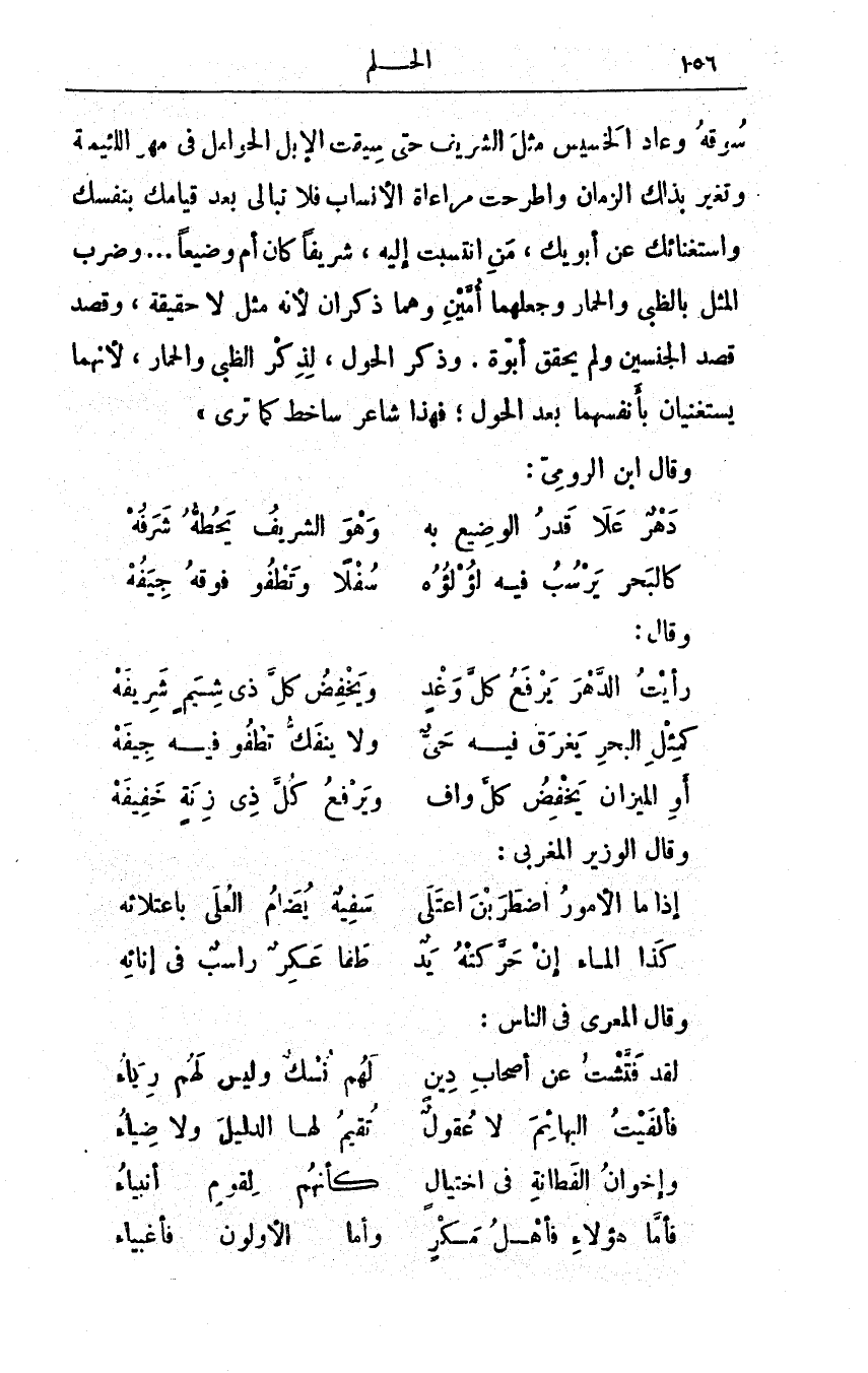 سوقُه وعاد الخَسيسُ مثل الشريف حتى سيقت الإبلُ الحواملُ في مهر اللئيمة وتغيّر بذلك الزمان واطّرحت مراعاة الأنساب فلا تبالي بعد قيامك بنفسك واستغنائك عن أبويك، مَنِ انْتسبت إليه، شريفاً كان أم وضيعاً. . . . . وضرب المثل بالظبي والحمار وجعلهما أُّمَّيْنِ وهما ذكران لأنّه مثل لا حقيقة، وقصد قصد الجنسين ولم يُحقّق أبوّة. وذكر الحول، لذكر الظبي والحمار، لأنهما يستغنيان بأنفسهما بعد الحول؛ فهذا شاعر ساخط كما ترى
