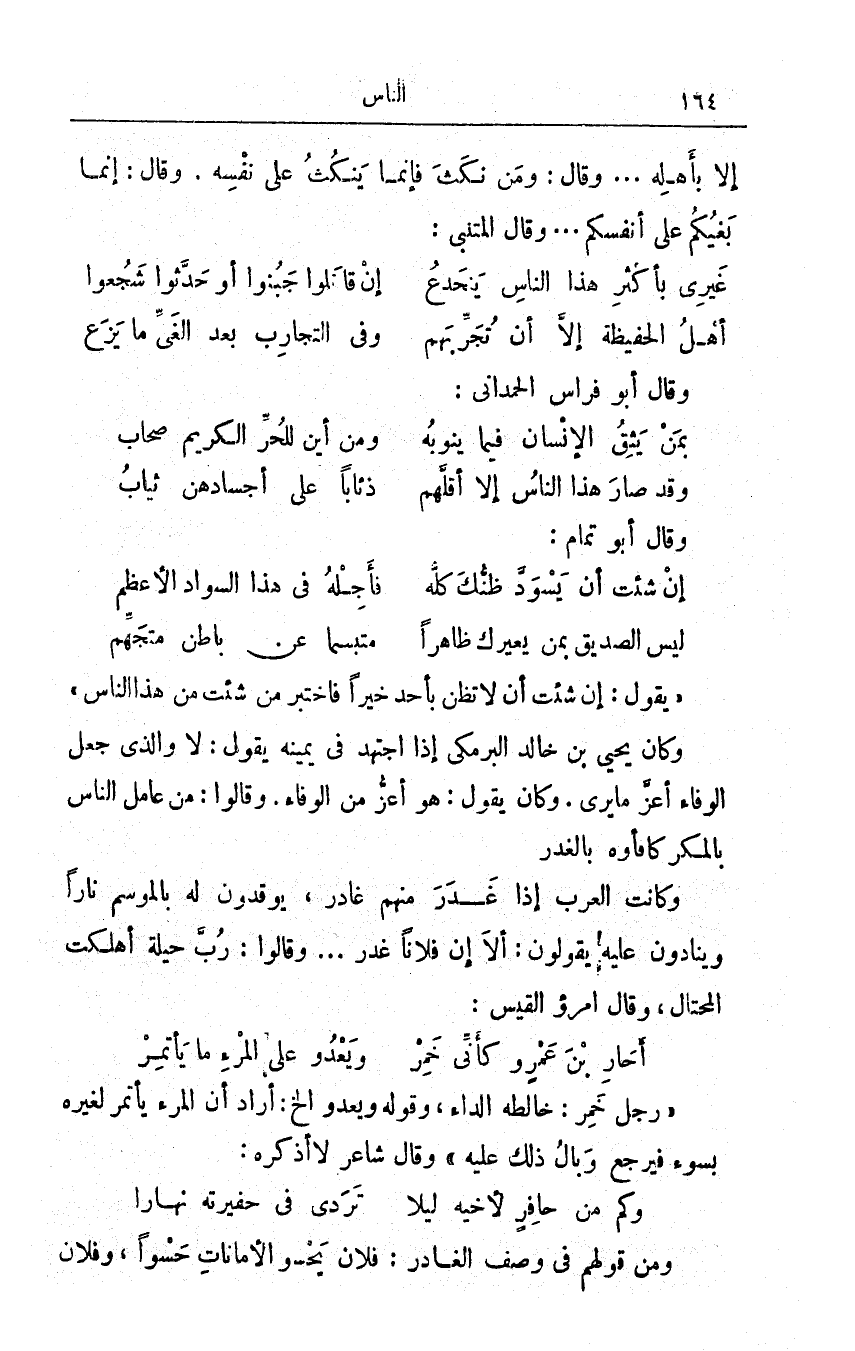 يقول: إن شئت أن لا تظن بأحد خيراً فاختبر من شئت من هذا الناس، وكان يحيى بن خالد البرمكي إذا اجتهد في يمينه يقول: لا والذي جعل الوفاء أعزَّ ما يرى. وكان يقول: هو أعزُّ من الوفاء. وقالوا: من عامل الناس بالمكر كافؤوه بالغدر. وكانت العرب إذا غدر مِنْهم غادرٌ، يُوقدون له بالموسم ناراً وينادون عليه يقولون: ألا إن فلاناً غدر. . . . وقالوا: ربَّ حيلة أهلكت المحتال، وقال امرؤ القيس: