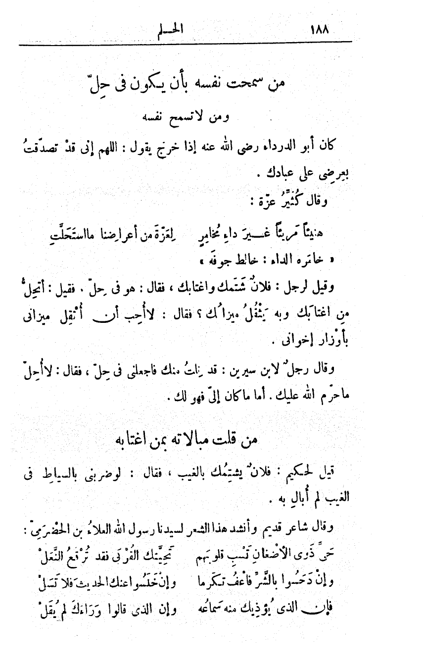 وقيل لرجل: فلانٌ شتمك واغتابك، فقال: هو في حِلٍّ. فقيل: أتُحِلُّ من اغتابك وبه يثقل