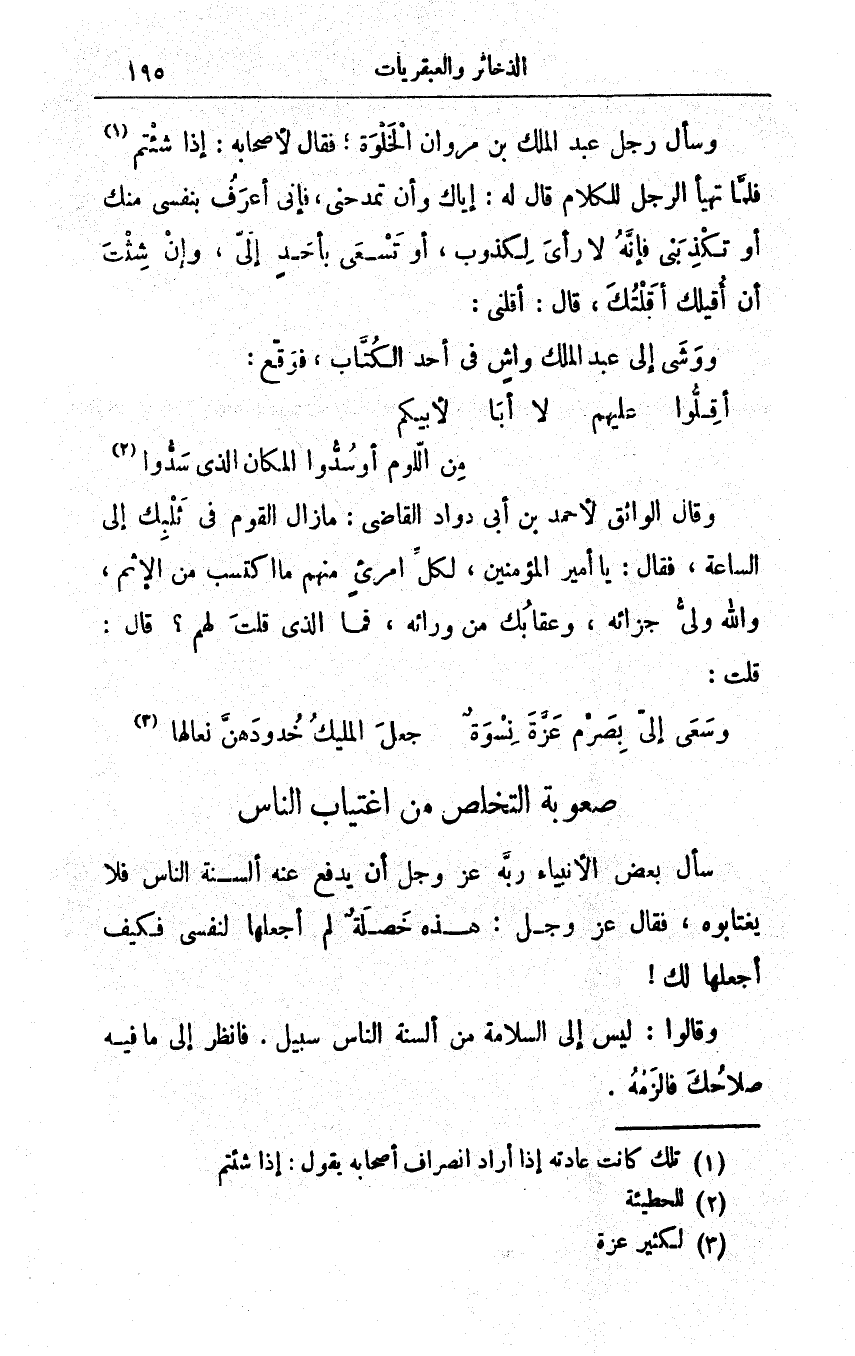 وسأل رجل عبد الملك بن مروان الخلوةَ؛ فقال لأصحابه: إذا شئتم فلمَّا تهيّأ الرّجل للكلام قال له: إيّاك وأن تمدَحَني، فإنّي أعرفُ بنفسي منك أو تكذبَني فإنَّه لا رأيَ لكذوب، أو تسعى بأحدٍ إليّ، وإنْ شئتَ أنْ أقيلَك أقلْتُك، قال: أقِلْني.