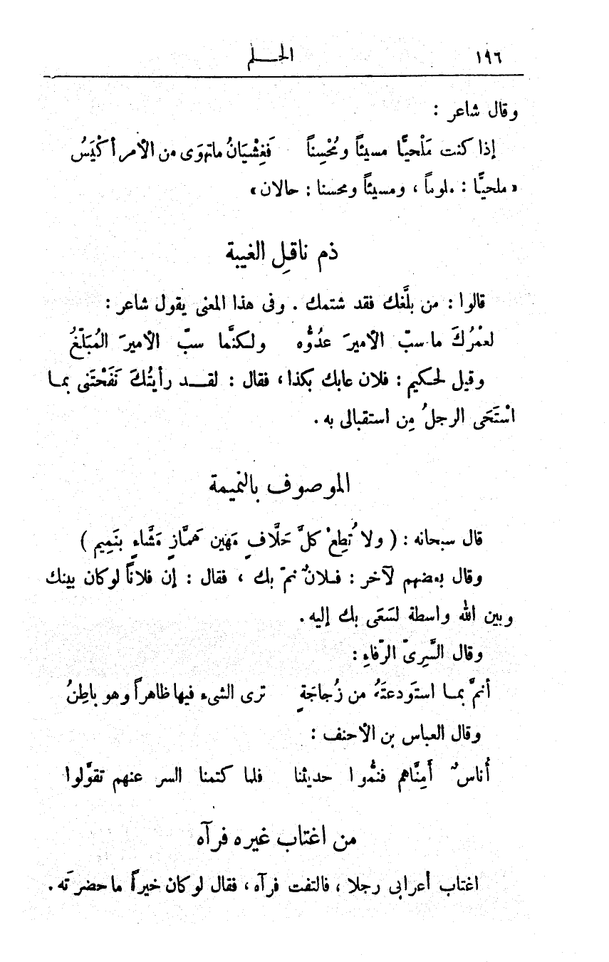 قال سبحانه: {وَلَا تُطِعْ كُلَّ حَلَّافٍ مَّهِينٍ، هَمَّازٍ مَّشَّاء بِنَمِيمٍ} وقال بعضُهم لآخر: فلانٌ نمَّ بك، فقال: إنَّ فلاناً لو كان بينك وبين الله واسطةٌ لسعَى بكَ إليه. وقال السَّريُّ الرّفاء: