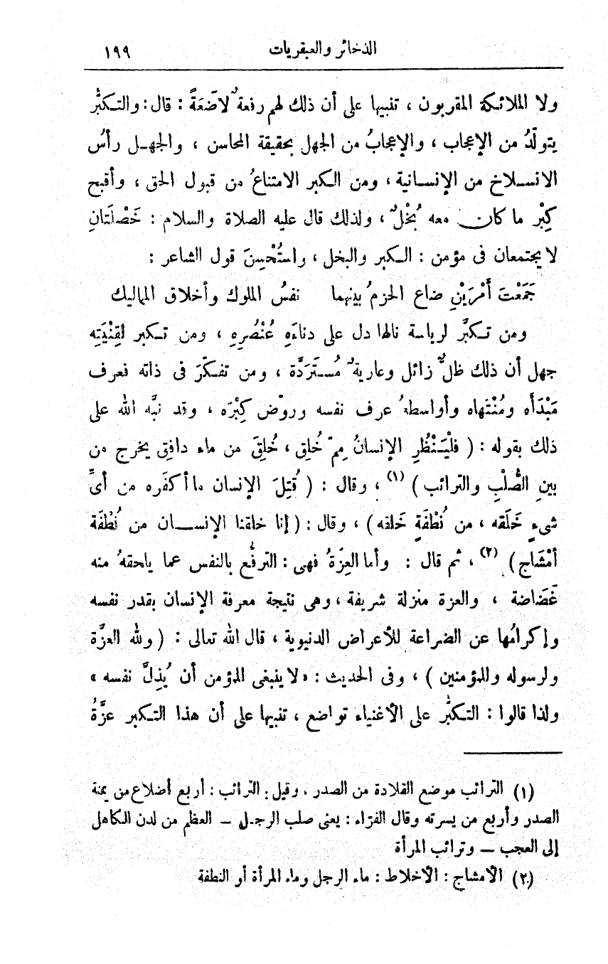 ومن تكبر لرياسةٍ نالها دلَّ على دناءَة عُنْصره، ومن تكبَّر لِقِنْيَتِه جهلَ أنّ ذلك ظلٌّ زائلٌ وعاريةٌ مُستردّة، ومن تفكّر في ذاته فعرف مبدأه ومُنتهاه وأواسِطه عرفَ نفسَه وروَّض كِبْرَه، وقد نبَّه اللهُ على ذلك بقوله: {فَلْيَنظُرِ الْإِنسَانُ مِمَّ خُلِقَ، خُلِقَ مِن مَّاء دَافِقٍ، يَخْرُجُ مِن بَيْنِ الصُّلْبِ وَالتَّرَائِبِ}، وقال: {قُتِلَ الْإِنسَانُ مَا أَكْفَرَهُ، مِنْ أَيِّ شَيْءٍ خَلَقَهُ، مِن نُّطْفَةٍ خَلَقَهُ} وقال: {إِنَّا خَلَقْنَا الْإِنسَانَ مِن نُّطْفَةٍ أَمْشَاجٍ}، ثم قال: وأمّا العِزّة فهي: الترفُّع بالنفس عما يلحقه منه غضاضة، والعِزّة منزلةٌ شريفة، وهي نتيجةُ معرفة الإنسان بقدر نفسه وإكرامُها