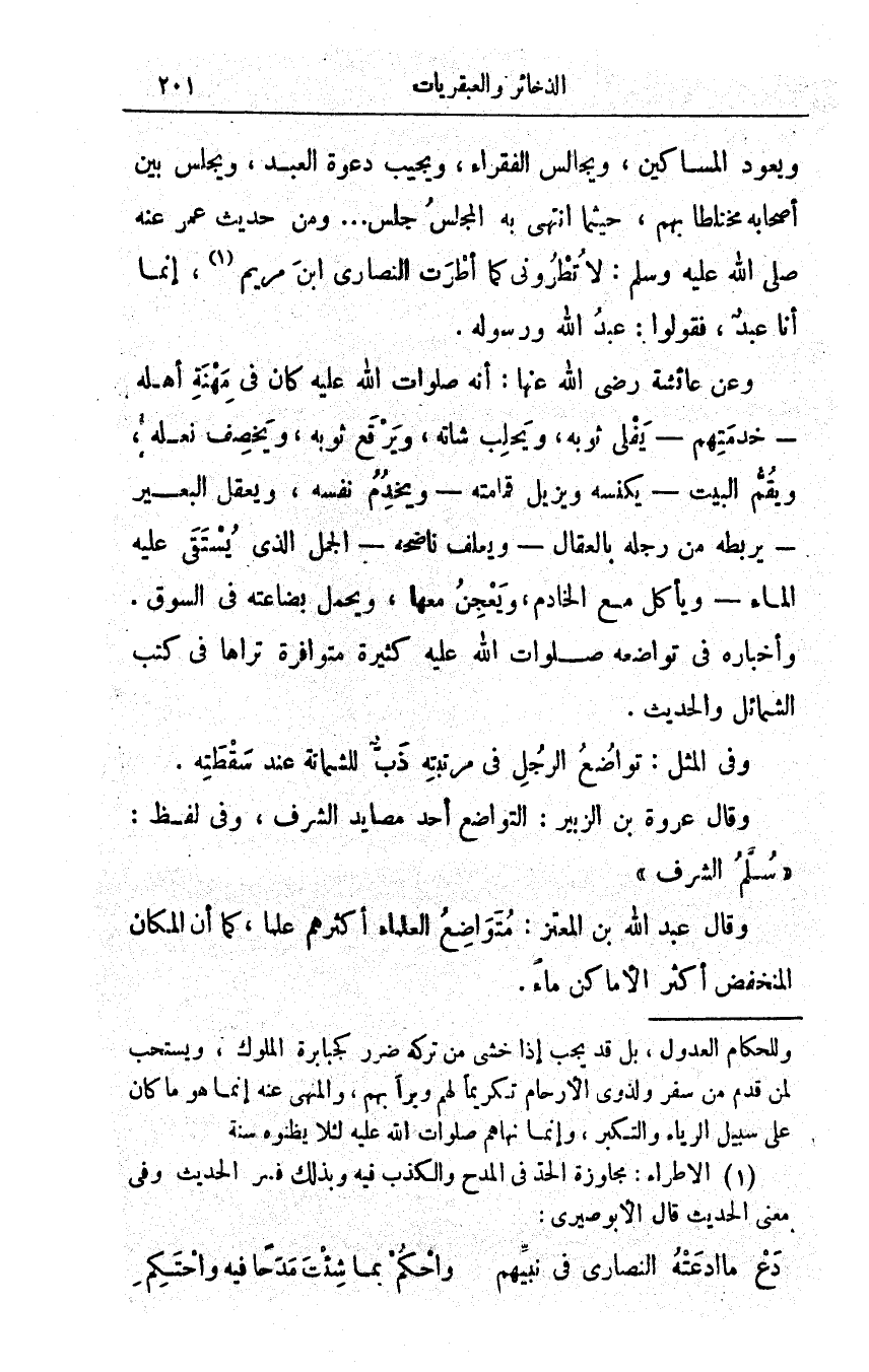 ويعود المساكين، ويجالس الفقراء، ويجيب دعوة العبد، ويجلس بين أصحابه مختلطاً بهم، حيثما انتهى به المجلس جلس. . . ومن حديث عُمر عنه صلى الله عليه وسلم: (لا تُطروني كما أطرت النّصارى ابْنَ مريم، إنّما أنا عبدٌ، فقولوا عبدُ الله ورسولُه). وعن عائشة رضي الله عنها: أنه صلوات الله عليه كان في مهنةِ أهلِه - خدمتهم - يَفلي ثوبه، ويحلب شاتَه، ويرقع ثوبه، ويخصف نعلَه، ويقُمُّ البيتَ - يكنسه ويزيل قمامته - ويخدم نفسَه، ويعقل البعيرَ - يربطه من رجله بالعقال - ويعلف ناضِحَه - الجمل الذي يُستقى عليه الماء - ويأكل مع الخادم، ويعجن معها، ويحمل بضاعتَه في السوق.