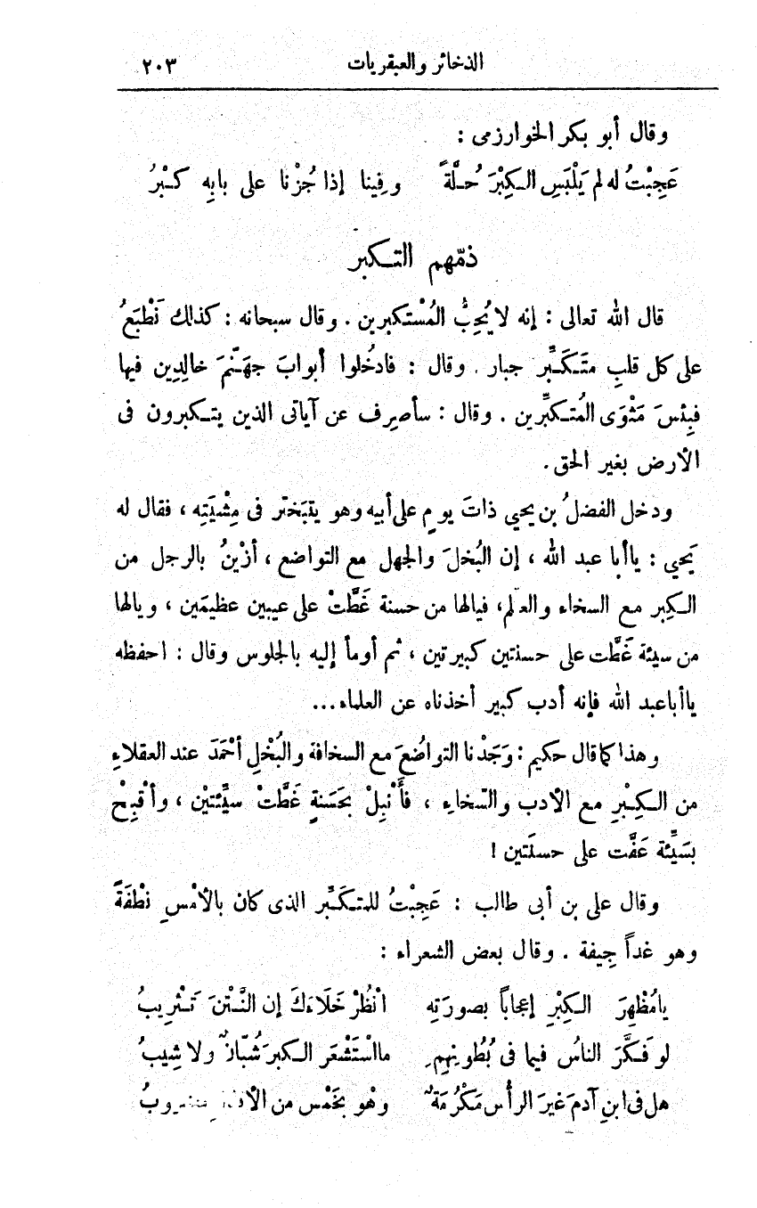 وهذا كما قال حكيم: وجدنا التواضعَ مع السخافةِ والبخلِ أحمدَ عندَ العقلاءِ من الكِبر مع الأدب والسخاءِ، فأنْبِلْ بحسنةٍ غطَّت سيئتين، وأقبِحْ بسيئةٍ عفَّت على حسنتين!