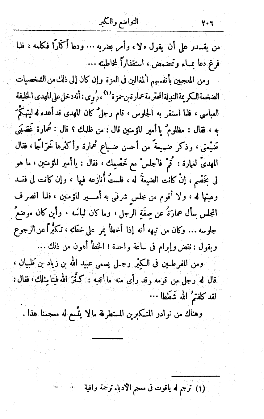 ومن المعجبين بأنفسهم المُغالين في العِزّة وإنْ كان إلى ذلك من الشّخصيات الضخمة الكريمة النبيلة المحترمة عُمارة بن حمزة، رُوي: أنّه دخلَ على المهديّ الخليفة العباسي، فلمّا استقرّ به الجلوسُ، قام رجلٌ كان المهديُّ قد أعدَّه له ليتهكَّم به، فقال: مظلومٌ يا أميرَ المؤمنين قال: من ظلمَك؟ قال: عُمارة غَصبَني ضَيْعَتي، وذكر ضيعةً من أحسن ضياع عُمارة وأكثرِها خَراجاً، فقال المهديّ لعُمارة: قُمْ فاجلِسْ مع خصمك، فقال: يا أمير المؤمنين، ما هو لي بخصم، إن كانت الضيعة له، فلست أنازعُه فيها، وإنْ كانَتْ لي فقد وهبتُها له، ولا أقومُ من مَجْلسٍ شرّفني به أميرُ المؤمنين، فلمّا انصرف المجلسُ سأل عُمارة عن صفةِ الرجل، وما كان لباسُه، وأين كان موضعُ جلوسه. . . وكان من تيهِه أنّه إذا أخطأ يمرُّ على خطئِه، تكبُّراً عن الرجوع ويقول: نقضٌ وإبرامٌ في ساعة واحدة! الخطأ أهونُ من ذلك. . .
