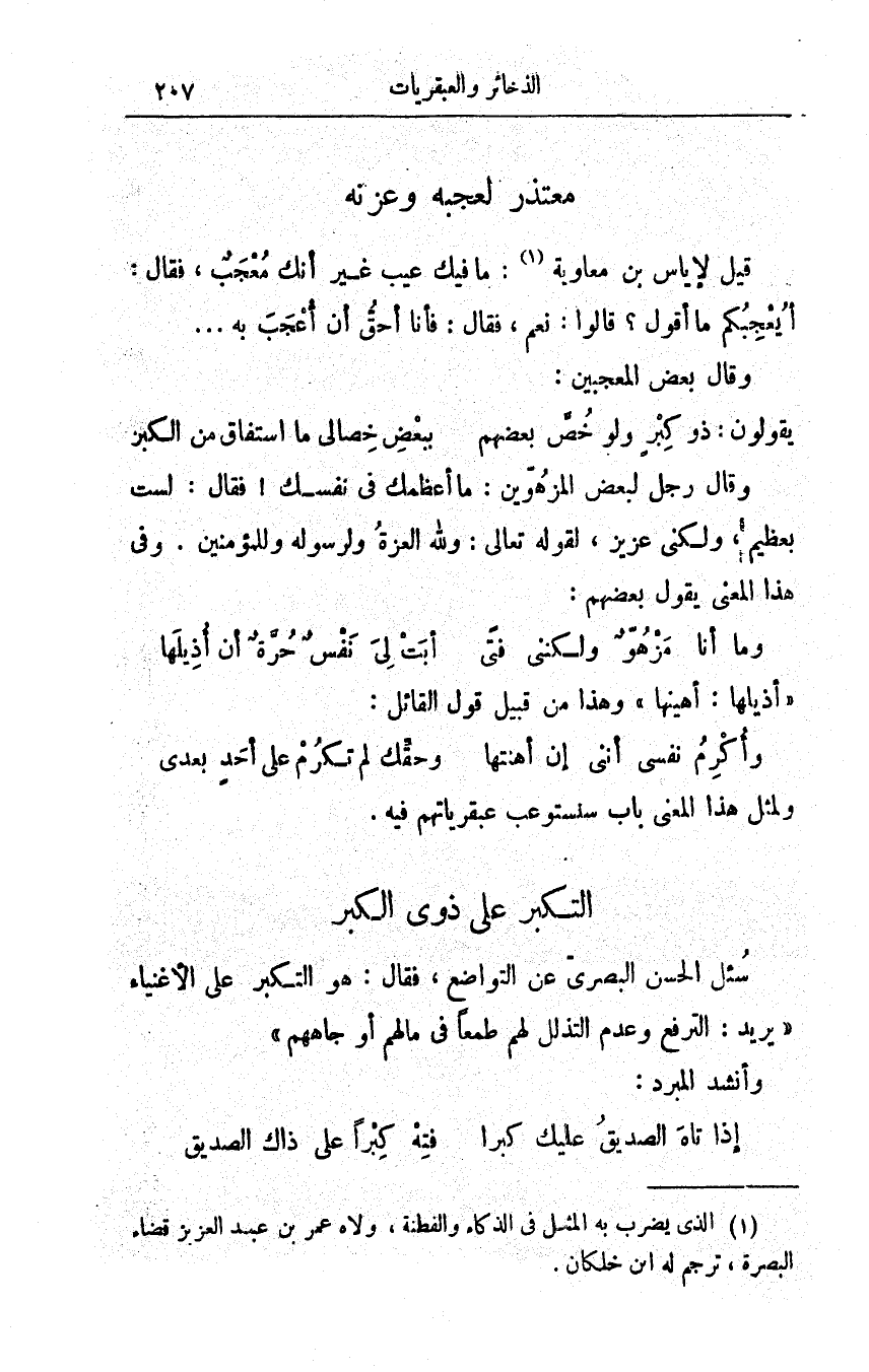 وقال رجلٌ لبعض المزهوّين: ما أعظمَك في نفسِك! فقال: لستُ بعظيمٍ، ولكنّي عزيزٌ، لقوله تعالى: {وَلِلَّهِ الْعِزَّةُ وَلِرَسُولِهِ وَلِلْمُؤْمِنِينَ}. وفي هذا المعنى يقول بعضهم: