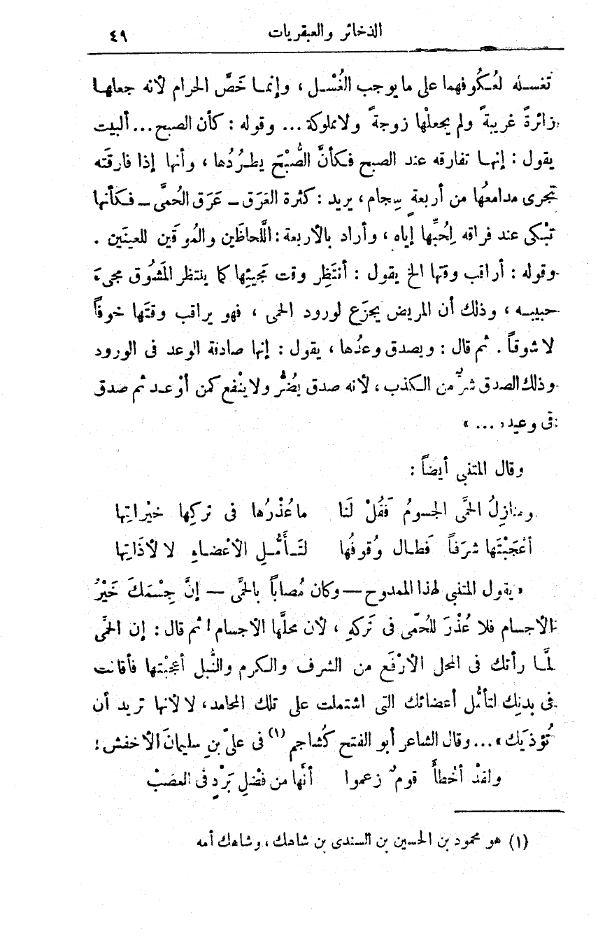 تغسله لِعُكوفِهما على ما يُوجب الغُسْل، وإنّما خَصَّ الحَرام لأنّه جعلها زائرة غريبة ولم يَجْعلْها زوجةً ولا مملوكةً. . . وقوله: كأنّ الصبحَ. . . البيت يقول: إنّها تفارقه عند الصبح فكأنَّ الصُّبحَ يطردها، وأنّها إذا فارقته تجري مدامعُها من أربعةٍ سِجامٍ، يريد كثرةَ العرق - عرق الحمُّى - فكأنّها تبكي عند فراقِه لِحُبِّها إياه، وأراد بالأربعة: اللَّحاظين والمُوقَين للعينَين. وقوله: أراقبُ وقتها إلخ يقول: أنتظر وقتَ مجيئِها كما ينتظرُ المَشوقُ مجيءَ حبيبه، وذلك أنّ المريض يجزعُ لوُرودِ الحُمّى، فهو يُراقب وقتها خوفاً لا شوقاً. ثم قال: ويَصدق وعدُها، يقول: إنّها صادقةُ الوعد في الورود وذلك الصدق شَرٌّ من الكذب، لأنه صدقٌ يضر ولا ينفع كمن أوْعدَ ثم صَدقَ في وعيدِه. . . وقال المتنبي أيضاً: