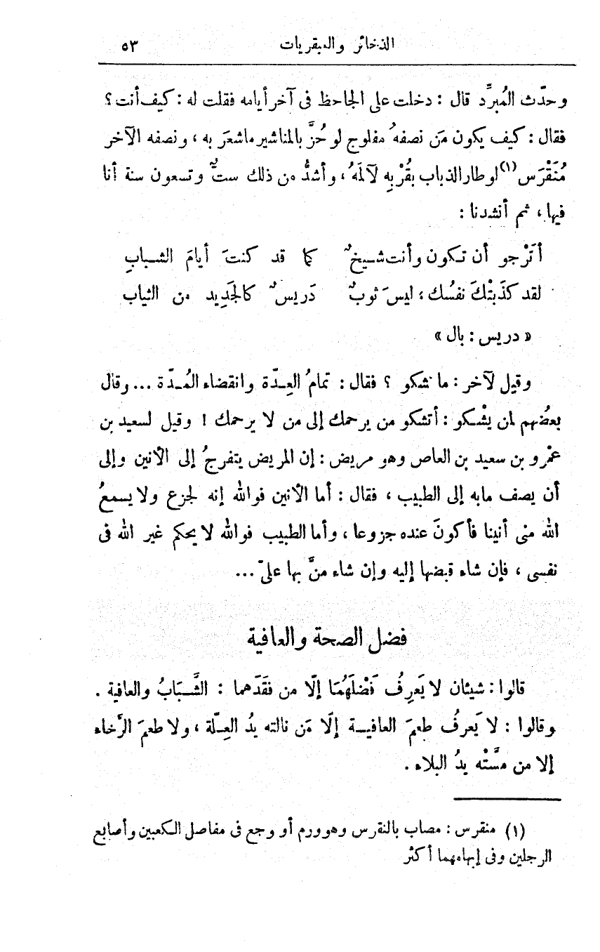 وحدّثَ المبرِّد قال: دخلت على الجاحظِ في آخر أيّامه فقلت له: كيف أنت؟ فقال: كيف يكون من نِصْفُه مَفلوج لو حُزَّ بالمناشيرِ ما شَعَرَ به، ونِصْفُه الآخرُ مُنَقْرَس لو طار الذُّبابُ بِقُرْبِه لآلمَه، وأشدُّ من ذلك سِتٌّ وتِسعون سنةً أنا فيها، ثم أنشدنا: