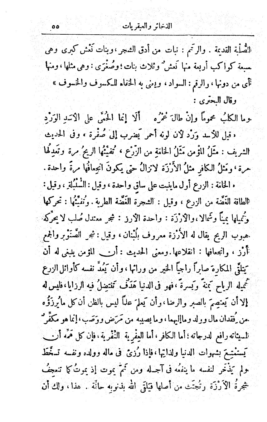 قيل للأسد وَرْدٌ لأنّ لونَه أحمرُ يضربُ إلى صُفرة، وفي الحديث الشريف: (مثلُ المؤمنِ مثلُ الخامَةِ من الزَّرع تُفَيِّئها الرّيحُ مرّةً وتَعْدِلُها مَرة، ومثلُ الكافرِ مثلُ الأرْزةِ لا تزالُ حتّى يكونَ انْجِعافُها مرةً واحدة).