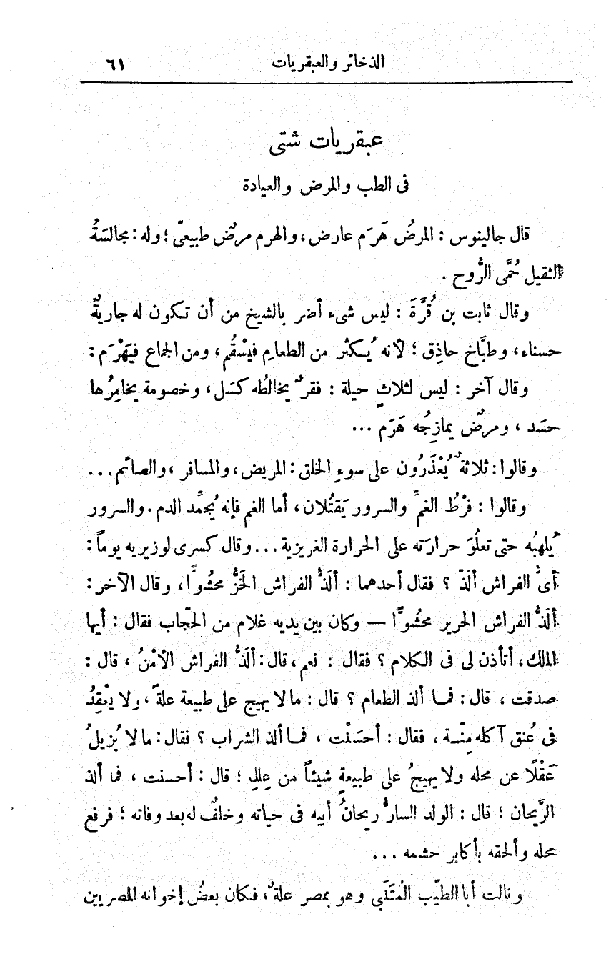 وقال ثابت بن قُرَّة: ليس شيء أضرّ بالشيخ من أن تكون له جارية حسناء، وطبَّاخٌ حاذق؛ لأنه يُكثر من الطعام فيَسقم، ومن الجماعِ فيَهرمُ: وقال آخر: ليس لثلاثٍ حيلةٌ: فقرٌ يخالِطه كسل، وخصومةٌ يخامِرها حسد، ومرضٌ يمازِجُه هرم. . .