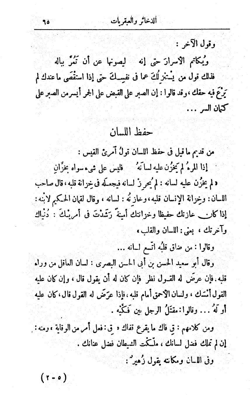 وقال أبو سعيد الحسن بن أبي الحسن البصري: لسانُ العاقلِ مِنْ وراء قلبه، فإنْ عرضَ له القولُ نظرَ فإنْ كان له أن يقولَ قال، وإنْ كانَ عليه القولُ أمْسك، ولسانُ الأحْمقِ أمامَ قلبه، فإذا عرض له القولُ قال، كان عليه أو له. . . وقالوا: مقتلُ الرجلِ بين فكَّيْه.