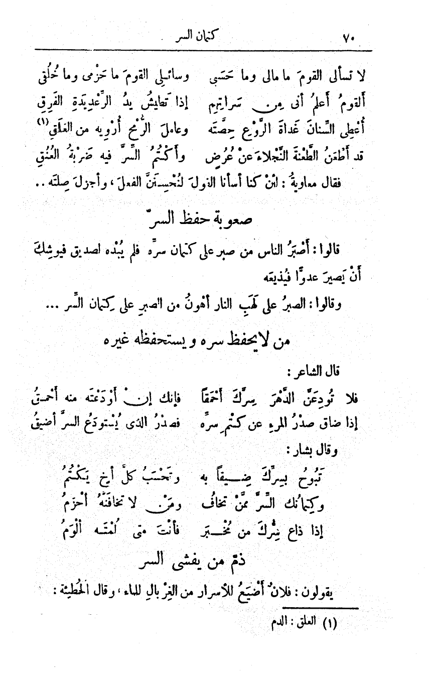 قالوا: أصبرُ الناسِ من صبرَ على كِتمانِ سِرِّه فلمْ يُبْدِه لصديقٍ فيوشكَ أن يصيرَ عدوَّاً فيُذيعَه