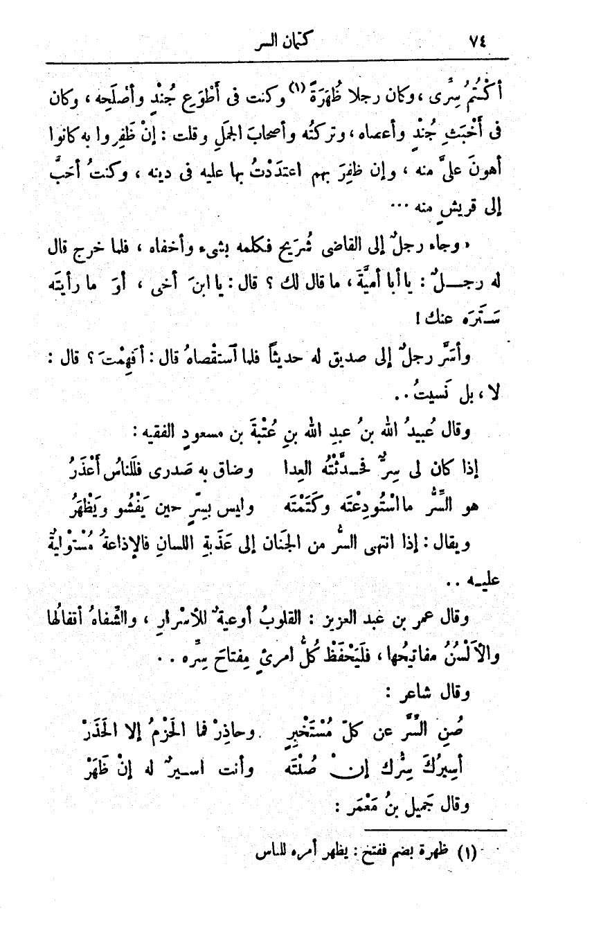 وقال عمر بن عبد العزيز: القلوبُ أوعيةٌ للأسْرارِ، والشِّفاهُ أقفالها والألسنُ مفاتيحُها، فلْيَحْفظ كلُّ امْرئٍ مِفتاحَ سِرِّه. . . .
