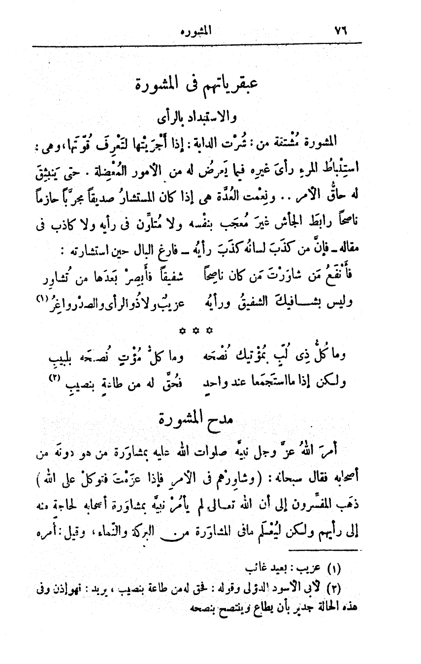 المشورة مشتقة من: شُرْتُ الدابةَ: إذا أجْرَيْتَها لِتَعرفَ قوّتها، وهي: استنباطُ المرءِ رأيَ غيره فيما يعرض له من الأمور المُعْضلة. حتى ينبثقَ له حاقُّ الأمْر. . ونِعْمَت العُدَّة هي إذا كان المستشارُ صديقاً مَجرَّباً حازِماً ناصِحاً رابطَ الجأشِ غيرَ مُعجبٍ بنفسه ولا متلوِّنٍ في رأيِه ولا كاذبٍ في مَقاله - فإنَّ مَنْ كَذَبَ لسانُه كذبَ رأيُه - فارغَ البال حينَ استشارته: