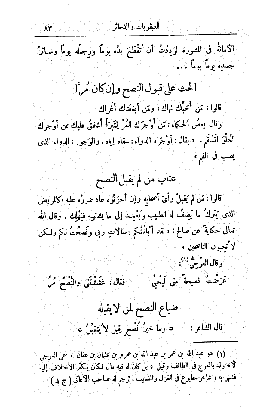 قالوا: من لم يقبل رأيَ أصحابه وإن أحْزَنوه عاد ضررُه عليه، كالمريض الذي يتركُ ما يصف لهُ الطبيبُ ويعمِدُ إلى ما يشتهيه فيهلك. وقال الله تعالى حكاية عن صالح: {لَقَدْ أَبْلَغْتُكُمْ رِسَالَةَ رَبِّي وَنَصَحْتُ لَكُمْ وَلَكِن لاَّ تُحِبُّونَ النَّاصِحِينَ}