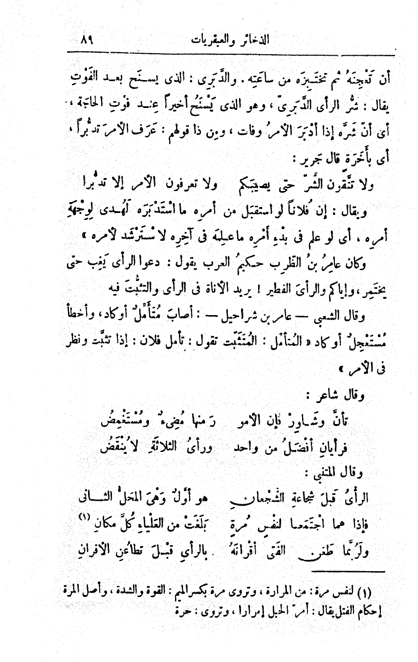 ويقال: إنّ فُلاناً لو اسْتَقبلَ مِن أمرِه ما اسْتَدْبَرَه لَهُدي لِوِجْهةِ أمْرِه، أي لو علمَ في بدء أمره ما علمه في آخره لاسْتَرْشَدَ لأمْرِه وكان عامر بنُ الظّرِبِ حكيمُ العربِ يقول: دَعوا الرأيَ يغِبْ حتّى يختمرَ، وإيّاكم والرأيَ الفطيرَ! يريدُ الأناةَ في الرأيِ والتثبُّتَ فيه. وقال الشّعبيّ - عامر ابْنُ شراحيل -: أصابَ مُتأمِّلٌ أو كاد، وأخْطأ مُسْتَعْجِلٌ أو كاد المتأمّل: المُتثبّت تقول: تأمل فلان: إذاً تثبّت ونَظَرَ في الأمر وقال شاعر: