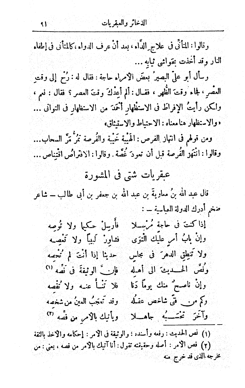وقالوا المتأنّي في علاج الدَّاء، بَعْدَ أن عرف الدواء، كالمتأني في إطفاءِ النار وقد أخذَتْ بِحواشي ثِيابه. . . وسأل أبو عليٍّ البصيرُ بعضَ الأمراءِ حاجةً: فقال له: رُحْ إلى وقْتِ العصر فجاء وقتَ الظهر، فقال: ألمْ أعِدْك وقتَ العَصْر؟ فقال: نعم، ولكن رأيتُ الإفراطِ في الاسْتِظْهارِ أحْمدَ من الاستظهارِ في التواني. . . والاستظهار هنا معناه: الاحتياطُ والاستيثاق