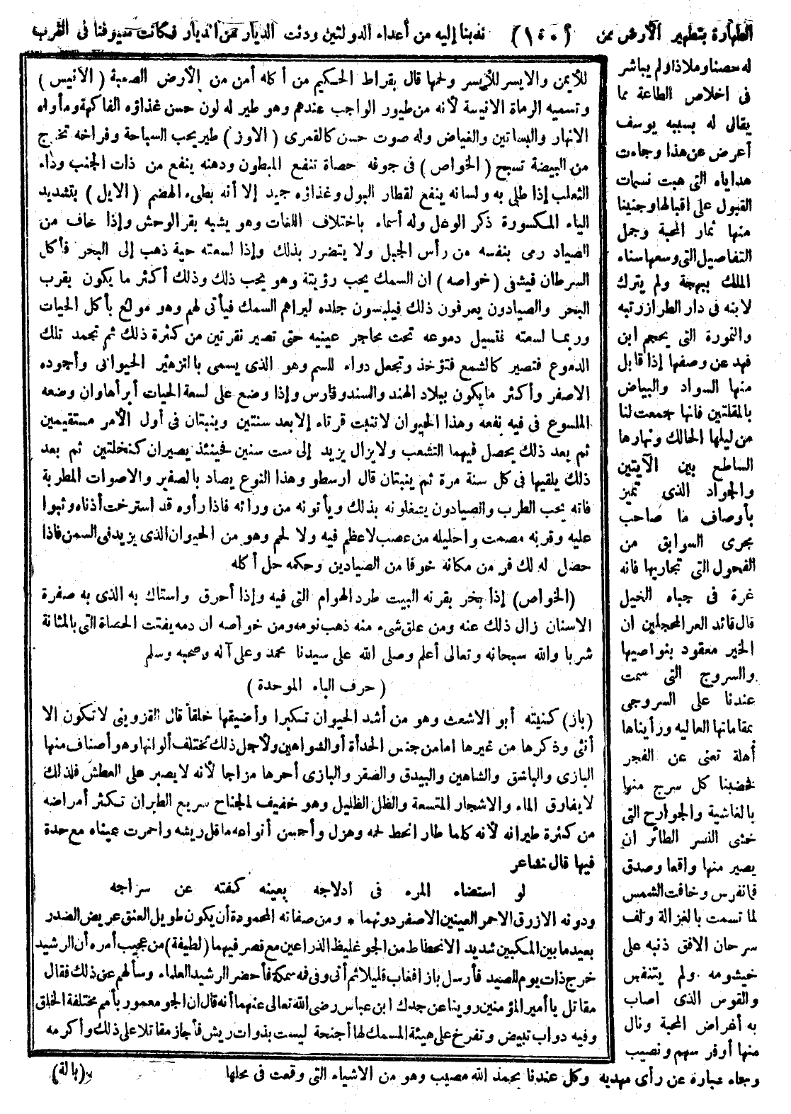 الطهارة بتطهير الأرض ممن ندبنا إليه من أعداء الدولتين، ودنت الديار من الديار فكانت سيوفنا في القرب له حصنا وملاذا، ولم يباشر في إخلاص الطاعة مما يقال على إقبالها وجنينا منها ثمار المحبة، وجمل التفاصيل التي وسعها سناء الملك ببهجة ولم يترك لابنه في دار الطراز رتبه، والنمورة التي يحجم ابن فهد عن وصفها إذا قابل منها السواد والبياض بالمقلتين، فإنها جمعت لنا من ليلها الحالك ونهارها الساطع بين الآيتين، والجواد الذي تميز بأوصاف صاحب مجرى السوابق من الفحول التي تجاريها، فإنه غرة في جباه الخيل التي قال قائد الغر المحجلين: إن الخير معقود بنواصيها، والسروج التي سمت على السروجي بمقاماتها العالية، ورأيناها أهلة تغني عن الفجر فخصبنا كل سرج منها بالغاشية، والجوارح التي خشي النسر الطائر أن يصير منها واقعا وصدق فيما تفرس، وخافت الشمس لما تسمت بالغزالة ولف سرحان الأفق ذنبه على خيشومه ولم يتنفس، والقوس الذي اصاب به أغراض المحبة ونال منها أوفر سهم ونصيب، وجاء عبارة عن رأي مهديه وكل عندنا بحمد الله مصيب، وهو من الأشياء التي وقعت في محلها