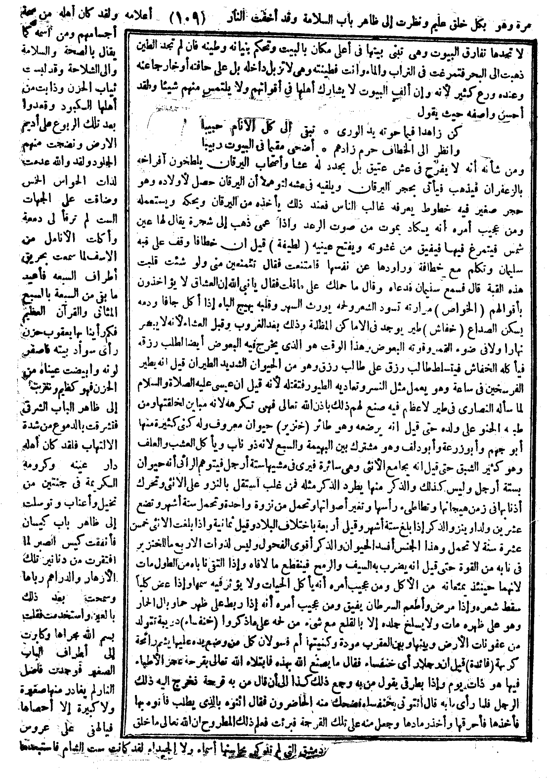 مرة وهو بكل خلق عليم، ونظرت إلى ظاهر باب السلامة وقد أخفت النار أعلامه، ولقد كان أهله من صحة أجسامهم ومن اسمه كما يقال بالصحة والسلامة، وإلى الشلاحة وقد لبست ثياب الحزن وذابت من أهلها الكبود، وقعدوا بعد تلك الربوع على أديم الأرض ونضجت منهم الجلود، ولقد والله عدمت لذات الحواس الخمس وضاقت عليّ الجهات الست فلم ترقأ لي دمعة، وأكلت الأنامل من الأسف لما سمعت بحريق أطراف السبعة، فأعيذ ما بقي من السبعة بالسبع المثاني والقرآن العظيم، فكم رأينا بها يعقوب حزن رأى سواد بيته فاصفر لونه وابيضت عيناه من الحزن فهو كظيم، وتغربت إلى ظاهر الباب الشرقي فتشرقت بالدمع من شدة الالتهاب، فلقد كان أهله من دار عينه وكرومه الكريمة في جنتين من نخيل وأعناب، وتوسلت إلى ظاهر باب كيسان فانفقت كيس الصبر لما افتقرت من دنانير تلك الأزهار والدراهم رباها، وسمحت بعد ذلك بالعين واستخدمت فقلت بسم الله مجراها، وكابرت إلى أطراف الباب الصغير فوجدت فاضل النار لم يغادر منها صغيرة ولا كبيرة إلا أحصاها، فيا لهفي على عروس دمشق التي لم تذكر محاسنها أسماء ولا الجيداء، لقد كانت ست الشام فاستعبدها