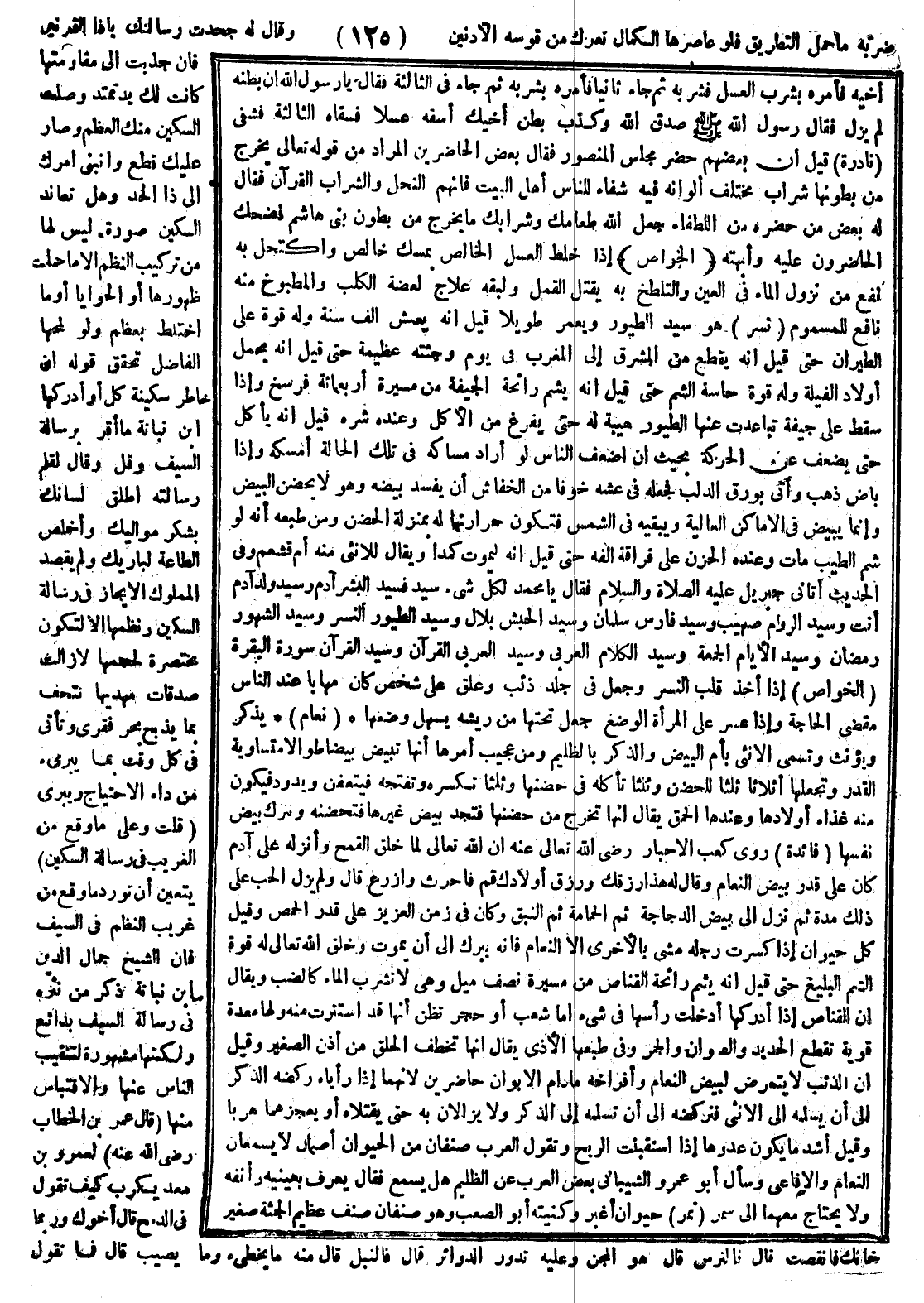 ضربه ما حمل التطريق، فلو عاصرها الكمال لعرك من قوسه الأذنين، وقال له جحدت رسالتك يا ذا القرنين، فإن جذبت إلى مقاومتها كانت لك يد تمتد، وصلت السكين منك العظم وصار عليك قطع وانتهى أمرك إلى ذا الحد، وهل تعاند السكين صورة ليس لها من تركيب النظم، إلا ما حملت ظهورها أو الحوايا أو ما اختلط بعظم، ولو لمحها الفاضل تحقق قوله إنّ خاطر سكينه كلّ، أو أدركها ابن نباتة ما أقر برسالة السيف وفل، وقال لقلم رسالته أطلق لسانك بشكر مواليك، وأخلص الطاعة لباريك، ولم يقصد المملوك الإيجاز في رسالة السكين ونظمها؛ إلا لتكون مختصرة لحجمها، لا زالت صدقات مهديها تتحف بما يذبح نحر فقري، وتأتي في كل وقت بما يبرىء من داء الاحتياج ويري، قلت وعلى ما وقع من الغريب في رسالة السكين يتعيَّن أن نورد ما وقع من غريب النظم في السيف فإن الشيخ جمال الدين ابن نباتة ذكر من نثره في رسالة السيف بدائع ولكنها مشهورة لتنقيب الناس عنها والاقتباس منها.