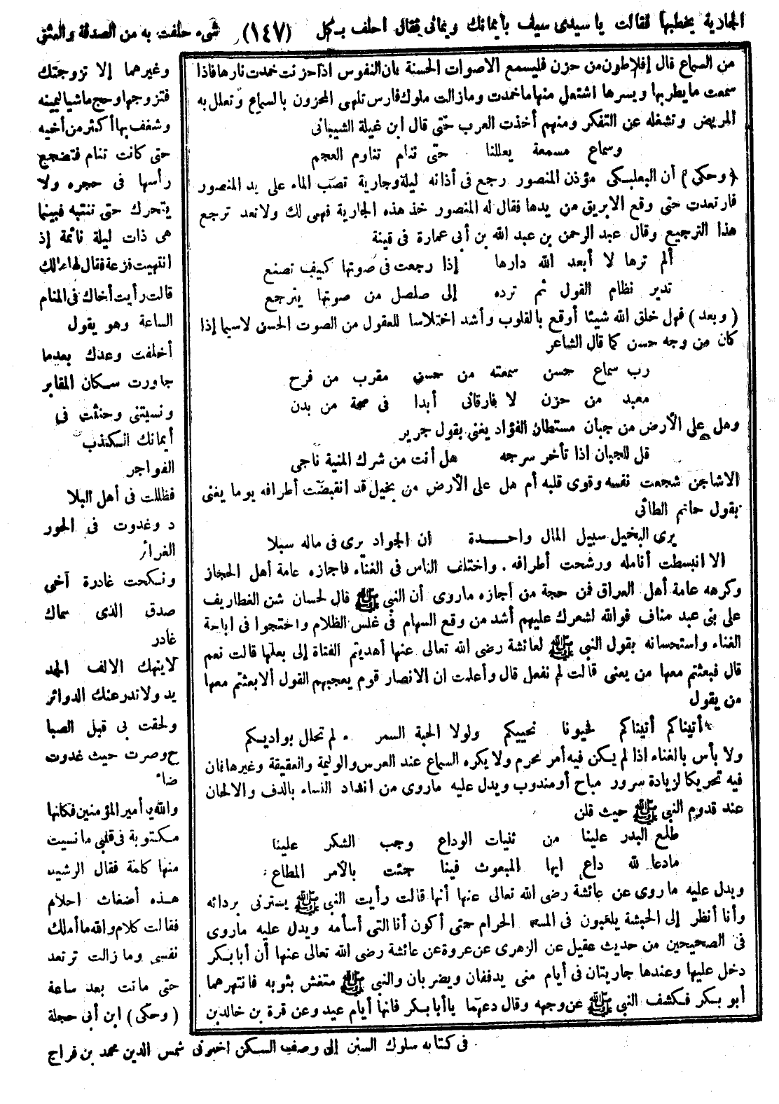 الجارية يخطبها فقالت يا سيدي كيف وبما أيمانك فقال أحلف بكل شيء حلفت به من الصدقة والعتق وغيرهما إلا تزوجتك فتزوجها وحجَّ ماشياً ليمينه وشغف بها أكثر من أخيه حتى كانت تنام فيضجع رأسها في حجره ولا يتحرك حتى تنتبه فبينما هي ذات ليلة نائمة غذ انتبهت فزعة فقال لها مالك قالت رأيت أخاك في المنام الساعة وهو يقول: