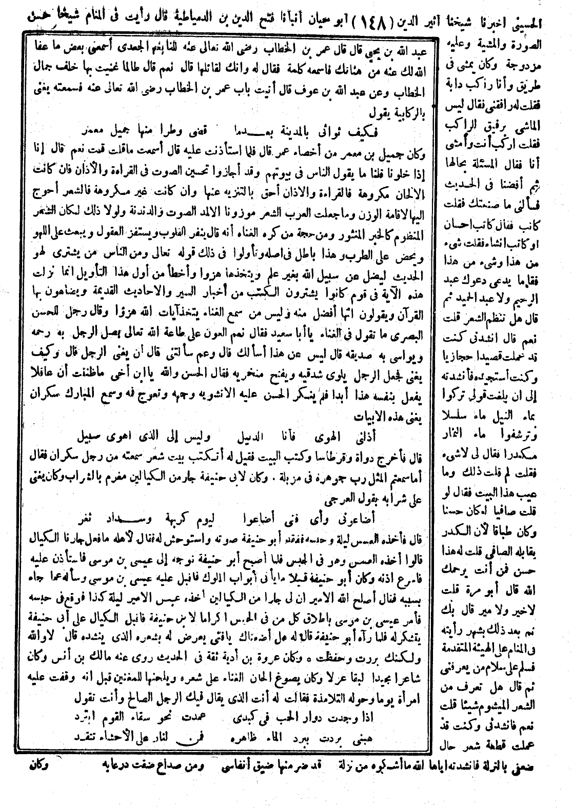 الحسيني أخبرنا شيخنا أثير الدين أبو حيان أنبأنا فتح الدين بن الدمياطية قال رأيت في النام شيخاً حسن الصورة والمشية وعليه مزدوجة وكأنا نمشي في طريق وأنا راكب دابة فقلت له رافقني فقال ليس الماشي برفيق الراكب فقلت إركب أنت وأمشي أنا فقال المسئلة بحالها ثم أفضنا في الحديث فسألني ما صنعتك فقلت كاتب فقال كاتب إحسان أو كاتب إنشاء فقلت شيء من هذا وشيء من هذا فقال ما يدَّعي دعواك عبد الرحيم ولا عبد الحميد ثم قال هل تنظم الشعر قلت نعم قال أنشدني وكنت قد عملت قصيداً حجازياً وكنت أستجيده فأنشدته إلى أن بلغت قولي: