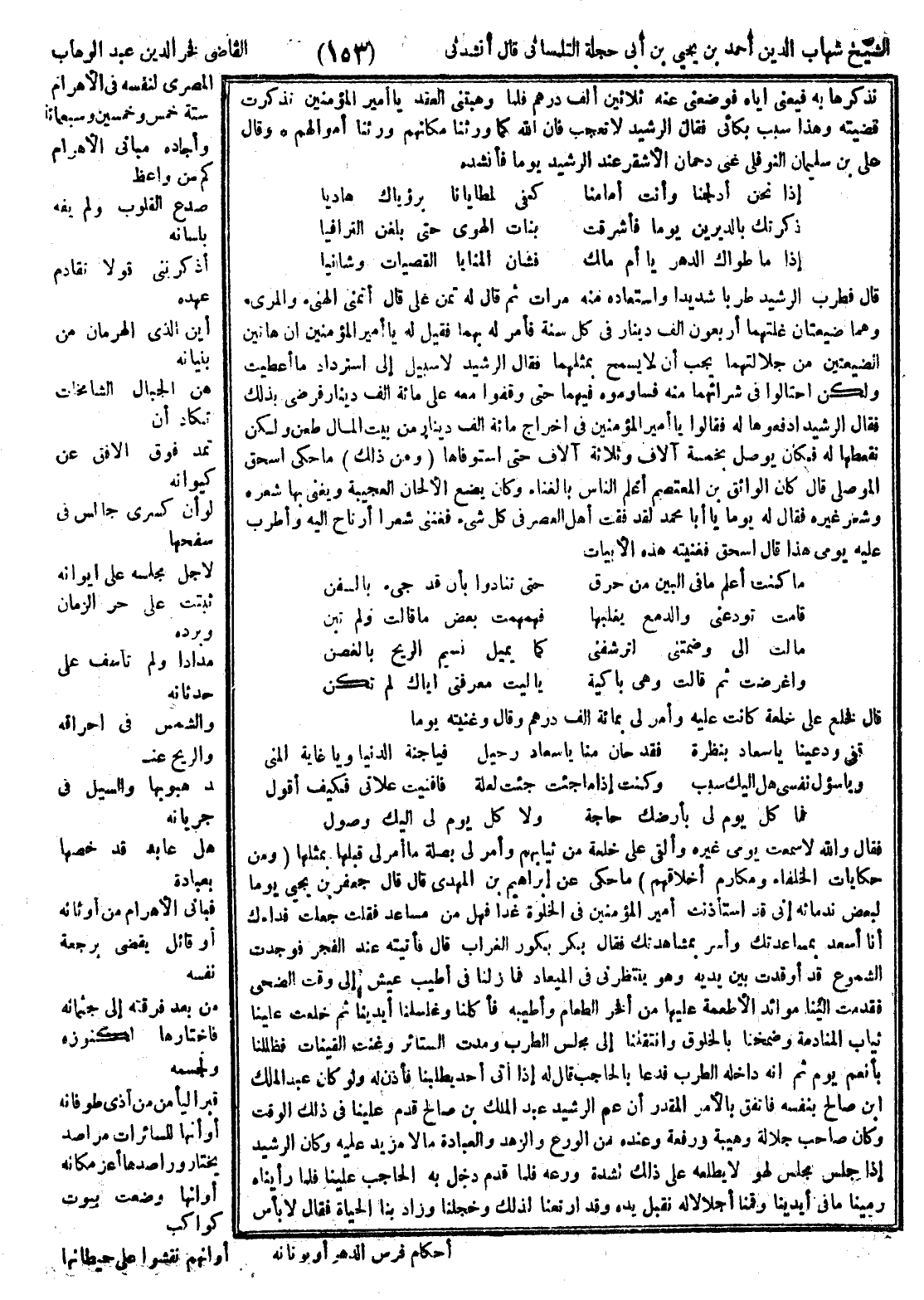 الشيخ شهاب الدين أحمد بن يحيى ابن أبي حجلة التلمساني قال أنشدني القاضي فخر الدين عبد الوهاب المصري لنفسه في الأهرام سنة خمس وخمسين وسبعمائة وأجاد: