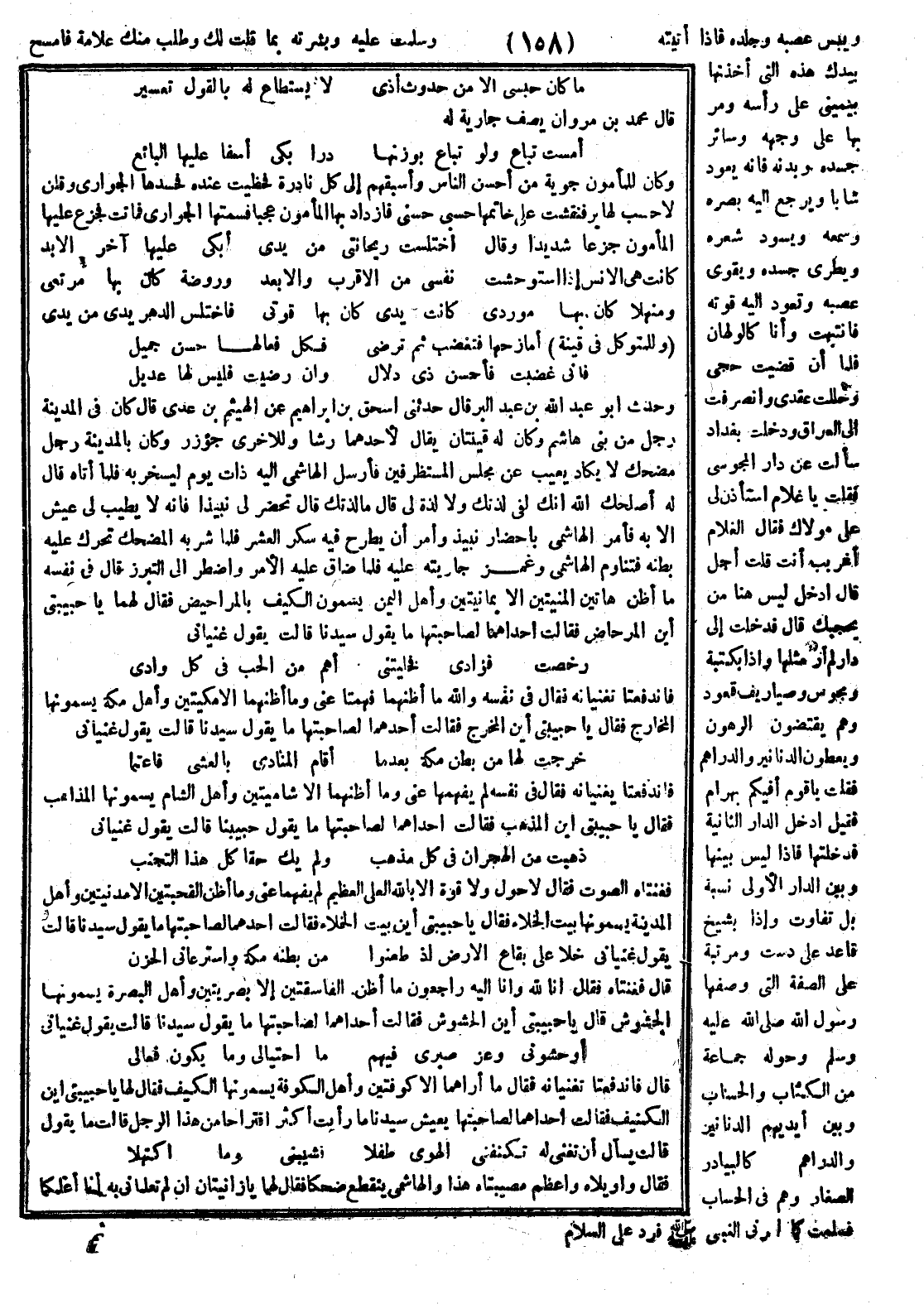 ويبس عصبه وجلده فإذا أتيته وسلمت عليه وبشرته بما قلت لك وطلب منك علامة فأمسح بيدك هذه التي أخذتها بيميني على رأسه ومر بها على وجهه وسائر جسده وبدنه فإنه يعود شاباً ويرجع إليه بصره وسمعه ويسود شعره ويطرى جسده ويقوى عصبه وتعود إليه قوته فانتبهت وأنا كالولهان فلما أن قضيت حجي وحللت عقدي وانصرفت إلى العراق ودخلت بغداد سألت عن دار المجوسي فقلت يا غلام استأذن لي على مولاك فقال الغلام أغريب أنت قلت أجل قال أدخل ليس هنا من يحجبك قال فدخلت إلى دار لم أرّ مثلها وإذا بكتبة ومجوس وصياريف قعود وهم يقبضون الرهون ويعطون الدنانير والدراهم فقلت يا قوم افيكم بهرام فقيل أدخل الدار الثانية فدخلتها فإذا ليس بينها وبين الدار الأولى نسبة بل تفاوت وإذا بشيخ قاعد على دست ومرتبة على الصفة التي وصفها رسول الله صلى الله عليه وسلم وحوله جماعة من الكتاب والحساب وبين أيديهم الدنانير والدراهم كالبيادر الصغار وهم في الحساب فسلمت كما أمرني النبي صلى الله عليه وسلم فرد علي السلام