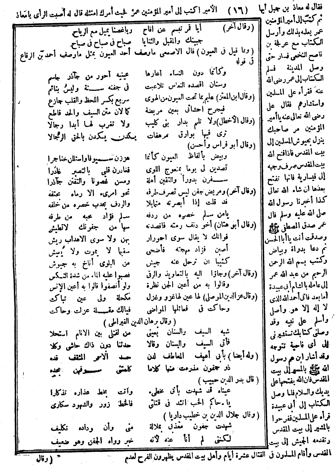 فقال له معاذ بن جبل أيها الأمير أكتب لأمير المؤمنين عمر فحيث أمرك أمتثله قال له أصبت الرأي يا معاذ ثم كتب إلى أمير المؤمنين عمر يعلمه بذلك وأرسل الكتاب إلى عرفجة بن ناصح النخعي فسار حتى وصل المدينة فسلم الكتاب إلى عمر رضي الله عنه فقرأه على المسلمين واستشارهم فقال عليّ رضي الله تعالى عنه يا أمير المؤمنين مر صاحبك ينزل بجيوش المسلمين إلى بيت المقدس فإذا فتح الله بيت المقدس صرف وجهه إلى قيسارية فإنها تفتح بعدها إن شاء الله تعالى كذا أخبرنا رسول الله صلى الله عليه وسلم قال عمر صدق المصطفى صلى الله عليه وسلم وصدقت يا أبا الحسن ثم دعا بدواة وبياض وكتب بسم الله الرحمن الرحيم من عبد الله عمر إلى عامله بالشام أبي عبيدة أما بعد فإني أحمد الله الذي لا إله إلا هو وأصلي على نبيه وقد وصلني كتابك تستشيرني إلى أي ناحية تتوجه وقد أشار ابن عم رسول الله صلى الله عليه وسلم بالمسير إلى بيت المقدس فإن الله يفتحها على يدك والسلام فلما وصل الكتاب إلى أبي عبيدة قرأه على المسلمين ففرحوا بالمسير إلى بيت المقدس وتقدمه الجيش إلى بيت المقدس وأقام المسلمون في القتال عشرة أيام وأهل بيت المقدس يظهرون الفرح لعدم