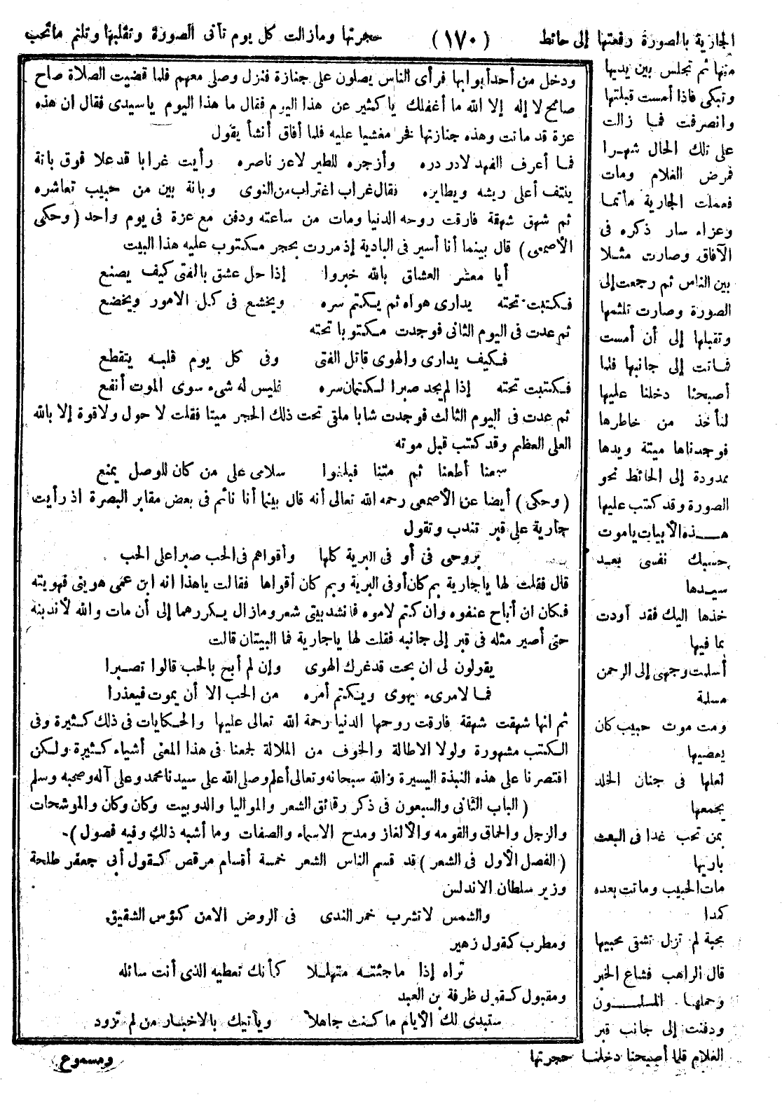 الجارية بالصورة رفعتها إلى حائط حجرتها وما زالت كل يوم تأتي الصورة وتقبلها وتلثم ما تحب منها ثم تجلس بين يديها وتبكي فإذا امست فما زالت على تلك الحال شهراً فمرض الغلام ومات فعملت الجارية مأتماً وعزاء سار ذكره في الآفاق وصارت مثلاً بين الناس ثم رجعت إلى الصورة وصارت تلثمها وتقبلها إلى أن أمست فماتت إلى جانبها فلما أصبحنا دخلنا عليها لنأخذ من خاطرها فوجدناها ميتة ويدها ممدودة إلى الحائط نحو الصورة وقد كتب عليه هذه الأبيات: