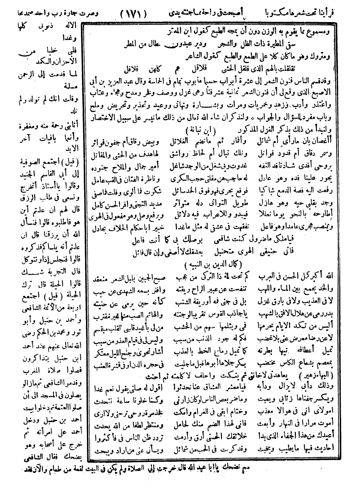 قيل اجتمع أربعة من الأئمة الشافعي وأحمد بن حنبل وأبو ثور ومحمد بن الحكم رضي الله عنهم عند أحمد بن حنبل يتذاكرون فصلوا صلاة المغرب وقدموا الشافعي ثم ما زالوا يصلون في المسجد إلى أن صلوا العتمة ثم دخلوا بيت أحمد بن حنبل ودخل أحمد على امرأته ثم خرج على أصحابه وهو يضحك فقال الشافعي مم تضحك يا أبا عبد الله قال خرجت إلى الصلاة ولم يكن في البيت لقمة من طعام والآن فقد