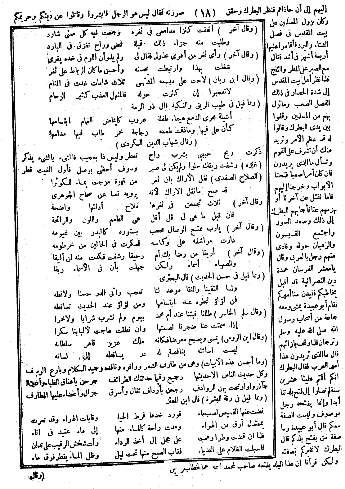 إليهم إلى أن حاذاهم فنظر البطرك وحقق صوته فقال ليس هو الرجل فأبشروا وقاتلوا عن دينكم وحريمكم وكان نزول المسلمين على بيت المقدس في فصل الشتاء والبرج فأقاموا عليها أربعة أشهر في أشد قتال مع الصبر على المطر والثلج فلما نظر أهل بيت المقدس إلى شدة الحصار في ذلك الفصل الصعب وما نزل بهم من المسلمين وقفوا بين يدي البطرك وقالوا له قد عظم الأمر ونريد منك أن تشرف على القوم وتسأل من الذي يريدون فإن كان أمراً صعباً فتحنا الأبواب وخرجنا إليهما فأما نقتل عن آخرنا أو نهزمهم عنا فأجابهم البطرك إلى ذلك وصعد السور والجتمع القسيسون والرهبان حوله ونادى منهم رجل بالعربي وقال يا معشر الفرسان عمدة دين النصرانية قد أقبل يخاطبكم فليدنُ منا أميركم فقام أبو عبيدة يمشي ومعه جماعة من أصحاب رسول الله صلى الله عليه وسلم وترجمان فلما وقف بإزائهم قال ما الذي تريدون هذا أمير العرب فقال البطرك إنكم لو أقمتم علينا عشرين سنة لم تصلوا إلى فتح بلدتنا أبداً وإنما يفتحه رجل موصوف وليست الصفة معكم قال أبو عبيدة وما صفة من يفتح بلدكم قال البطر لا نخبركم بصفة ولكن قرآنا إن هذا البلد يفتحه صاحب لمحمد اسمه عمر بن الخطاب