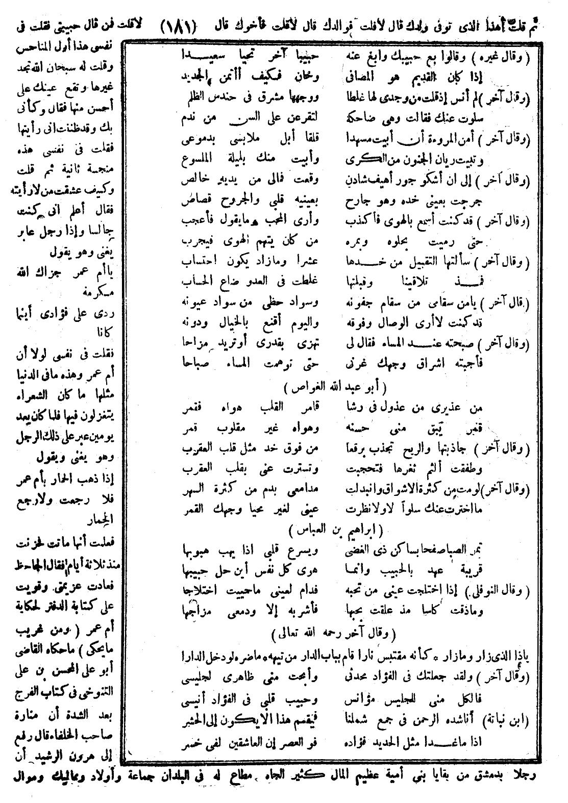ثم قلت أهذا الذي توفي ولدك قال لا قلت فوالدك قال لا قلت فأخوك قال لا قلت فمن قال حبيبتي فقلت في نفسي هذا أول المناحس وقلت له سبحان الله تجد غيرها وتقع عينك على أحسن منها فقال وكأني بك وقد ظننت أني رأيتها فقلت في نفسي هذه منحسة ثانية ثم قلت وكيف عشقت من لا رأيته فقال أعلم أني كنت جالسا وإذا رجل عابر يغني وهو يقول: