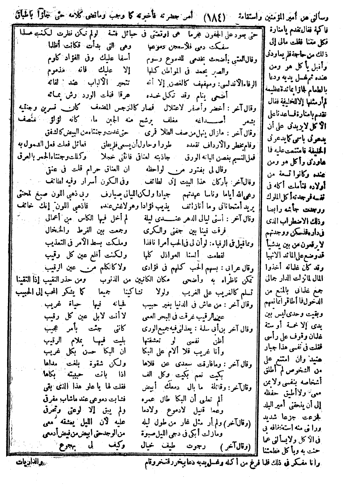 وسألني عن أمير المؤمنين واستقامة أمر حضرته فأخبرته كما وجب وما قضى كلامه حتى جاءوا بأطباق فاكهة فقال تقدم يا منارة فكُلْ معنا فقلت مالي إلى ذلك من حاجة فلم يعاودني وأقبل يأكل هو ومن عنده ثم غسل يديه ودعا بالطعام فجاءوا بمائدة عظيمة لم أرّ مثلها إلا للخليفة فقال تقدم يا منارة فساعدنا على الأكل لا يزيدني على أن يدعوني بإسمي كما يدعوني الخليفة فامتنعت عليه فما عاودني وأكل هو ومن عنده وكانوا تسعة من أولاده فتأملت أكله في نفسه فوجدته أكل الملوك ووجدت جأشه رابضاً وذلك الأضطراب الذي في داره قد سكن ووجدتهم لا يرفعون من بين يديه شيئاً قد وضع على المائدة إلا نهبا وقد كان غلمانه أخذوا المال لما نزلت الدار وجمالي وجميع غلماني بالمنع من الدخول فما أطاقوا ممانعتهم وبقيت وحدي ليس بين يدي إلا خمسة أو ستة غلمان وقوف على رأسي فقلت في نفسي هذا جبار عنيد وإن امتنع علي من الشخوص لم أطق إشخاصه بنفسي ولا بمن معي ولا أطيق حفظه إلى أن يلحقني أمير البلد فجزعت جزعاً شديداً ورابني منه استخفافه بي في الأكل ولا يسألني عما جئت به ويأكل مطمئناً وأنا مفكر في ذلك فلما فرغ من أكله وغسل يديه دعا ببخور فتبخر وقام