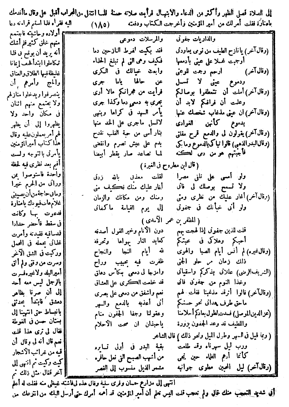 إلى الصلاة فصلى الظهر وأكثر من الدعاء والابتهال فرأيت صلاته حسنة فلما انتقل من المحراب أقبل علي وقال ما أقدمك يا منارة فقلت أمر لك من أمير المؤمنين وأخرجت الكتاب ودفعته إليه فقرأه فلما استتم قراءته دعا أولاده وحاشيته فاجتمع منهم خلق كثير فلم أشك أنه يريد أني وقع بي فلما تكاملوا ابتدأ فحلف إيماناً غليظة فيها الطلاق والعتاق والحج وأمرهم أن ينصرفوا ويدخلوا منازلهم ولا يجتمع منهم إثنان في مكان واحد