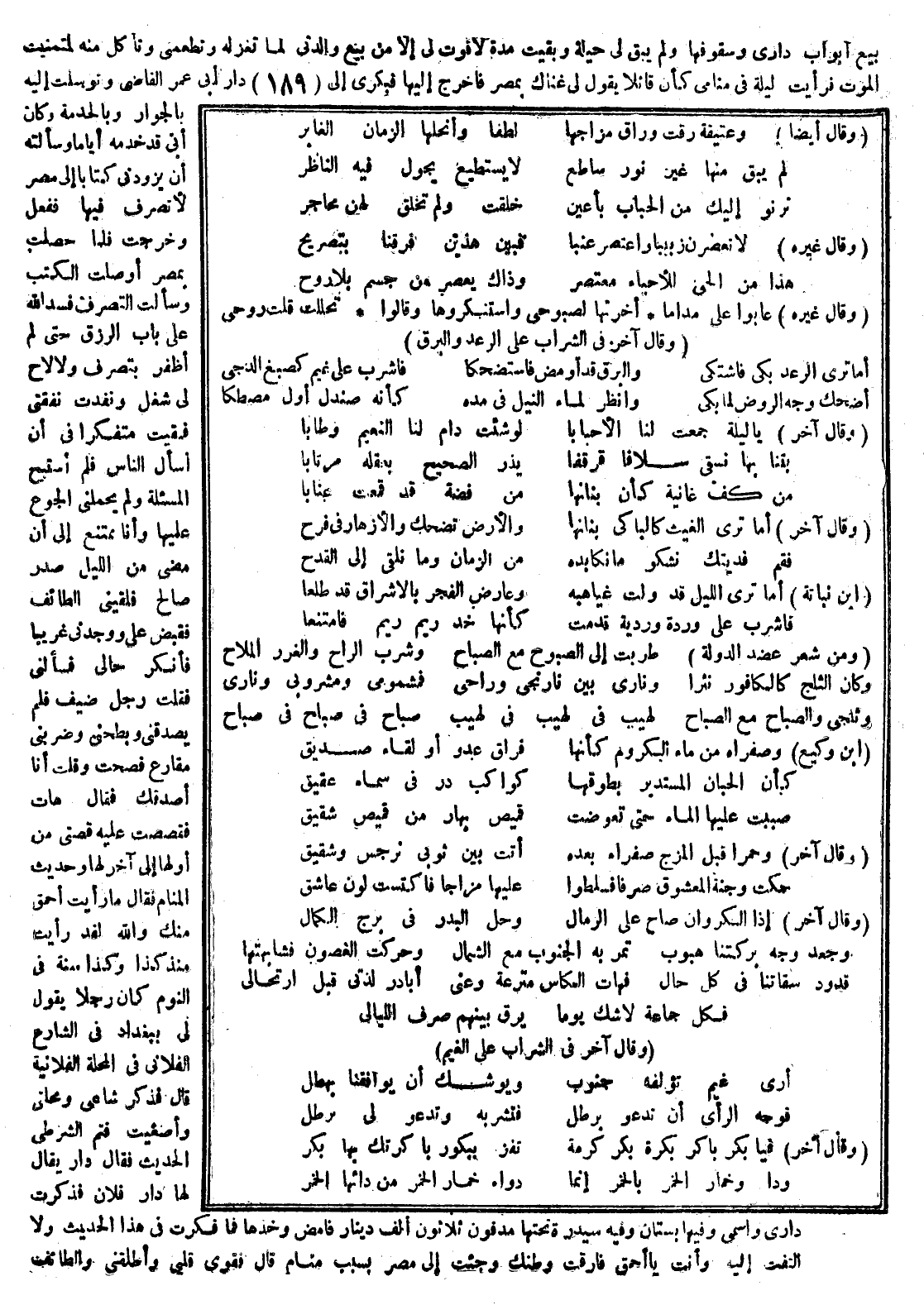 بيع أبواب داري وسقوفها ولم يبقَ لي حيلة وبقيت مدة لا قوت لي إلى والدتي لما تغزله وتطعمني وتأكل منه فتمنيت الموت فرأيت ليلة في منامي كأن قائلاً يقول لي غناك بمصر فأخرج إليها فبكرت إلى دار أبي عمر القاضي وتوسلت بالجوار وبالخدمة وكان أبي قد خدمه اياماً وسألته أن يزودني كتاباً إلى مصر لاتصرف فيها ففعل وخرجت فلما حصلت بمصر أوصلت الكتاب وسألت التصرف فسد الله عليَّ باب الرزق حتى لم أظفر بتصرف ولا لاح لي شغل ونفدت نفقتي فبقيت متفكراً في أن أسأل الناس فلم أستبح المسئلة ولم يحملني الجوع عليها وأنا ممتنع إلى أن مضى من الليل صدر صالح فلقيني الطائف فقبض علي ووجدني غريباً فأنكر حالي فسألن فقلت رجل ضيف فلم يصدقني وبطحني وضربني مقارع فصحت وقلت أنا أصدق فقال هات فقصصت عليه قصتي من أولها إلى آخرها وحديث المنام فقال ما رأيت أحمق منك والله لقد رأيت منذ كذا وكذا سنة في النوم كأن رجلاً يقول لي ببغداد في الشارع الفلاني في المحلة الفلانية قال فذكر شارعي ومحلتي وأصغيت فتم الشرطي الحديث فقال دار يقال لها دار فلان فذكر داري وأسمي وفيها بستان وفيه سدرة تحتها مدفون ثلاثون ألف دينار فامض وخذها فما فكرت في هذا الحديث ولا التفت إليه وأنت يا أحمق فارقت وطنك وجئت إلى مصر بسبب منام قال فقوي قلبي وأطلقني الطائف