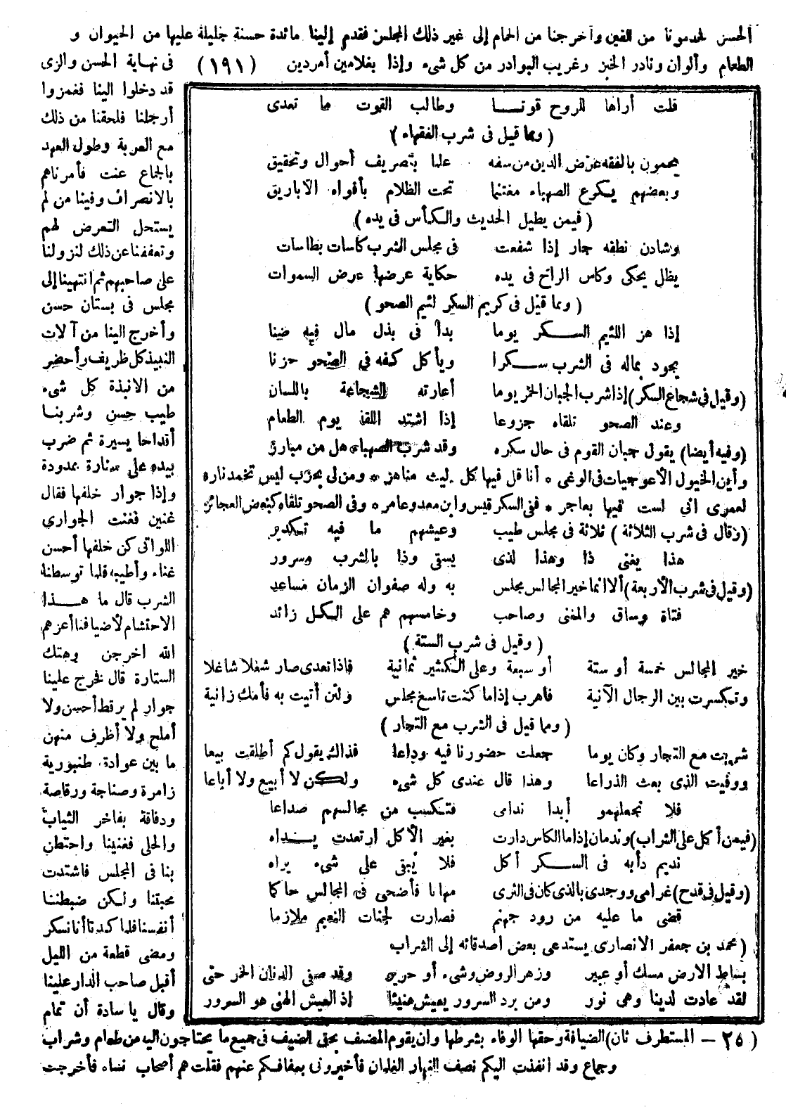 الحسن فخدمونا بدلا من القين وأخرجنا من الحمام إلى غير ذلك المجلس فقدم إلينا مائدة حسنة جليلة عليها من الحيوان وفاخر الطعام والألوان ونادر الخبز وغريب البوادر من كل شيء وإذا بغلامين أمردين في ناهية الحسن والزي قد دخلوا إلينا فغمزوا أرجلنا فلحقنا من ذلك مع الغربة وطول العهد بالجماع عنت فأمرناهم بالانصراف وفينا من لم يستحل التعرض لهم وتعففنا عن ذلك لنزولنا على صاحبهم ثم انتهينا إلى مجلس في بستان حسن وأخرج إلينا من آلات النبيذ كل ظريف وأحضر من الأنبذة كل شيء طيب حسن وشربنا أقداحا يسيرة ثم ضرب بيده على ستارة ممدودة وإذا جوار خلفها فقال غنين فغنت الجواري اللواتي كن خلفها أحسن غناء وأطيبه فلما توسطنا الشرب قال ما هذا الاحتشام لأضيافنا أعزهم الله أخرجن وهتك الستارة قال فخرج علينا جوار لم ير قط أحسن ولا أملح ولا أظرف منهن ما بين عوادة وطنبورية وزامرة وصناجة ورقاصة ودفافة بفاخر الثياب والحلي فغنيننا واحتطن بنا في المجلس فاشتدت محبتنا ولكن ضبطنا أنفسنا فلما كدنا أنا نسكر ومضى قطعة من الليل أقبل صاحب الدار علينا وقال يا سادة إن تمام الضيافة وحقها الوفاء بشرطها وأن يقوم المضيف بحق الضيف في جميع ما يحتاج إليه من طعام وشراب وجماع وقد أنفذت إليكم نصف النهار الغلمان فأخبروني بعفافكم عنهم فقلت هم أصحاب نساء فأخرجت
