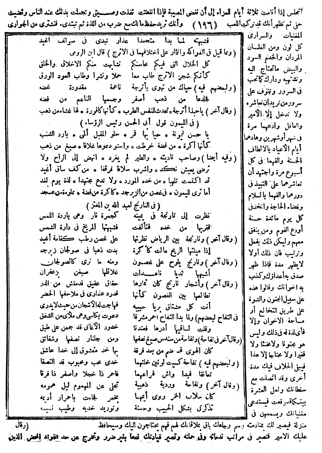 تعاشرهما على النبيذ في دورهما والقهما بالسلام وقضاء الحاجة واتخذ في كل يوم مائدة حسنةوادع القوم ومن يتفق معهم وليكن ذلك بعقل وترتيب فإن ذلك أولا لا يظهر مدة فإذا ظهر صدق به أعداؤك وكذب به إخوانك وقالوا هذه على سبيل المجون والشهوة على طرق التخالع أو مسامحة الإخوان وإلا فأي لذة له في ذلك وليس هو مجنونا ولا مخنثا ولا فقيرا ولا محتاجا إلى هذه فيبقى الخلاف فيك مدة أخرى وقد اتصلت مع سلطانك ولعل العشرة بينكما قد وقعت فيستدعي مغنياتك ويسمعهن في منزله فيصير لك بمنادمته رسم وجاهك باق بملاقاتك لهم فهم يحتاجون إليك وسيحافظ عليك الأمير فتصير في مراتب ندمائه وفي جملته وتصير قيادتك نفعا عليك بغير ضرر وتخرج عن حد القواد المحض الذين يؤذون وتكبس منازلهم قال فاعتقدت في الحال أن الصواب ما قاله ومات في علته فجلست ثلاثة أيام ثم أنفذت وصيته وما فيها كما أمرني ثم بيضت الدور وهي هذه وزدت فيها ما اشتهيت واستزدت في الآلات والفرش والأبنية كما أردت وابتعت هذه الجواري والغلمان والخدم من بغداد ودبرت أمري على ما قاله لي من غير مخالفة لشيء منه وأنا أفعل هذه منذ سنين كثيرة ما لحقني منه ضرر ولا خسران ولا فيه أكثر من إسقاط المروءة وقلة الاكتراث بالعيب وأنا أعيش أطيب عيش وأهنأه وأمر معاشي عليهم ودخلي بهم أكثر من خرجي ونعمتي الموروثة باقية بأسرها ما بعت منها شيئاً بحبة قط فما فوقها وقد اشتريت من هذه الصناعة عقارا جليلا وضفته إلى ما خلف علي وأمري يمشي كما ترون فقلنا يا هذا فرجت والله عنا واريتنا طريقاً إلى قضاء حقك وأخذنا نمازحه ونقول فضلك في هذه الصناعة غير مدفوع لأنك قواد ابن قواد وما كان الشيخ ليدبر لك هذه الأمر وهو بالقيادة أحذق منك فضحك وضحكنا وكان الفتى أديباً خفيف الروح وبتنا ليلتنا على تلك الحال فلما كان من الغد جمعنا له من بيننا ثلثمائة دينار وحملناها إليه ورحلنا عنه. ما على النبيذ في دورهما والقهما بالسلام وقضاء الحاجة واتخذ في كل يوم مائدة حسنةوادع القوم ومن يتفق معهم وليكن ذلك بعقل وترتيب فإن ذلك أولا لا يظهر مدة فإذا ظهر صدق به أعداؤك وكذب به إخوانك وقالوا هذه على سبيل المجون والشهوة على طرق التخالع أو مسامحة الإخوان وإلا فأي لذة له في ذلك وليس هو مجنونا ولا مخنثا ولا فقيرا ولا محتاجا إلى هذه فيبقى الخلاف فيك مدة أخرى وقد اتصلت مع سلطانك ولعل العشرة بينكما قد وقعت فيستدعي مغنياتك ويسمعهن في منزله فيصير لك بمنادمته رسم وجاهك باق بملاقاتك لهم فهم يحتاجون إليك وسيحافظ عليك الأمير فتصير في مراتب ندمائه وفي جملته وتصير قيادتك نفعا عليك بغير ضرر وتخرج عن حد القواد المحض الذين
