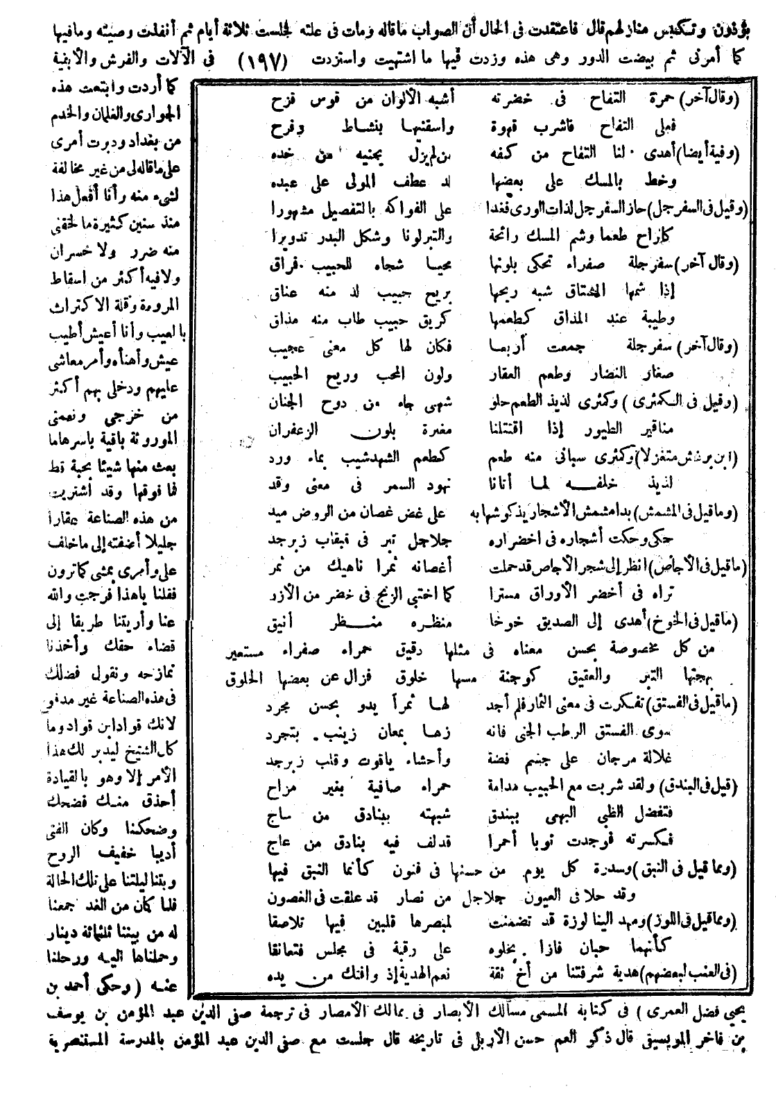 وحكى أحمد بن فضل العمري في كتابه المسمى مسالك الأبصار في ممالك الأمصار في ترجمة صفي الدين عبد المؤمن بن يوسف بن فاخر المويسيقي قال ذكر العم حسن الاربلي في تاريخه قال جلست مع صفي الدين عبد المؤمن بالمدرسة المستنصرية