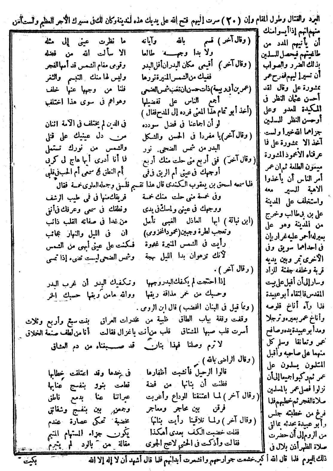 من البرد والقتال وطول المقام وإن سرت إليهم فتح الله على يديك هذه المدينة وكان لك في مسيرك الأجر العظيم ولست آمن منهم إنهم إذا آيسوا منك أن يأتيم المدد من طاغيتهم فيحصل للمسلمين بذلك الضرر والصواب أن تسير إليهم ففرح عمر بمشورة علي وقال لقد أحسن عثمان النظر في المكيدة للعدو وعلي أحسن النظر للمسلمين جزاهما الله خيراً ولست آخذ إلا بمشورة علي فما عرفناه إلا محمود المشورة ميمون الطلعة ثم إن عمر أمر الناس أن يأخذوا الأهبة للمسير معه واستخلف على المدينة علي بن أبي طالب وخرج من المدينة وهو على بعير له أحمر عليه غرارتان في إحداهما سويق وفي الأخرى تمر وبين يديه قربة وخلفه جفنة الزاد وسار إلى أن أقبل على بيت المقدس فالتقاه أبو عبيدة فلما رآه أناخ قلوصه وأناخ عمر بعيره وترجلا ومد أبو عبيدة يده وصافح عمر وتعانقا وسلم كل منهما على صاحبه وأقبل المسلمون يسلمون على عمر ثم ركبوا جميعاً إلى أن نزلوا فصلى عمر بالمسلمين صلاة الفجر ثم خطبهم فلما فرغ من خطبته جلس وأبو عبيدة يحدثه بما لقي من الروم إلى أن حضرت صلاة الظهر أذن بلال في ذلك اليوم فلما قال الله أكبر خشعت جوارحهم واقشعرت أبدانهم فلما قال أشهد أن لا إله إلا الله.