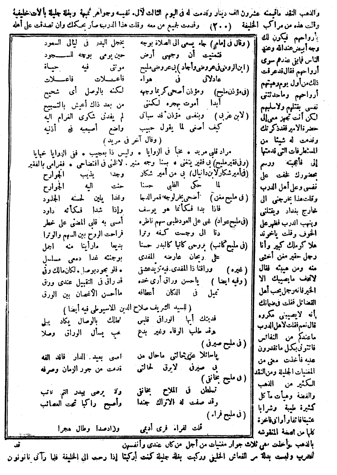 والذهب النقد ما قيمته عشرون ألف دينار وقدمت له في اليوم الثالث لآلىء نفيسة وجواهر ثمينة وبغلة جليلة بآلات خليفية وقلت هذه من مراكب الخليفة وقدمت لجميع من معه وقلت هذا الدرب صار بحكمك وإن تصدقت على أهله بأرواحهم فيكون لك وجه أبيض عند الله وعند الناس فما بقي عندهم سوى أرواحهم فقال قد عرفت ذلك من أول يوم وهبتهم أرواحهم وما حدثتني نفسي بقتلهم ولا سلبهم لكن أنت تجهز معي إلى حضرة الأمير فقد ذكرتك وقدمت له شيئاً من المستظرفات التي قدمتها إلي فأعجبته ورسم بحضورك فخفت على نفسي وعلى أهل الدرب وقلت هذا يخرجني إلى خارج بغداد ويقتلني وينهب الدرب فظهر عليَّ الخوف وقلت يا خوند هلاكو ملك كبير وأنا رجل حقير مغن أخشى منه ومن هيبته فقال لا تخف ما يصيبك إلا الخير فإنه رجل يحب أهل الفضائل فقلت في ضمانك أنه لا يصيبني مكروه قال نعم فقلت لأهل الدرب ما عندكم من النفائس فائتوني بكل ما تقدرون عليه فأخذت معي من المغنيات الجليلة ومن النقد الكثير من الذهب والفضة وهيأت مآكل كثيرة طيبة وشراباً كثيراً عتيقاً فائقا وأواني فاخرة كلها من الفضة المنقوشة بالذهب وأخذت معي ثلاث جوار مغنيات من أجلِّ من كان عندي وأنفسهن للضرب ولبست بدلة من القماش