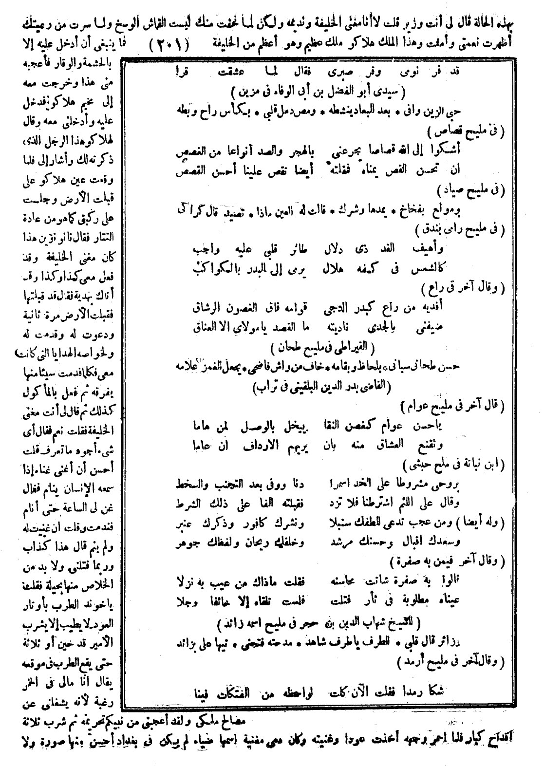 فأعجبه مني هذا وخرجت معه إلى مخيم هلاكو فدخل عليه وأدخلني معه وقال لهلاكو هذا الرجل الذي ذكرته لك وأشار إليَّ فلما وقعت عين هلاكو عليَّ قبلت الأرض وجلست على ركبتي كما هو من عادة التتار فقال نانو نوين هذا كان مغني الخليفة وقد فعل معي كذا وكذا وقد أتاك بهدية فقال قد قبلتها فقبلت الأرض مرة ثانية ودعوت له وقدمت له ولخواصه الهدايا التي كانت معي فكلما قدمت شيئاً منها يفرقه ثم فعل بالمأكول كذلك ثم قال لي أنت مغني الخليفة فقلت نعم فقال أي شيء أجود ما تعرف قلت أحسن أن أغني غناء أذا سمعه الإنسان ينام فقال غن لي الساعة حتى أنام فندمت وقلت إن غنيت له ولم ينم قال هذا كذاب وربما قتلني ولا بد من الخلاص منها بحيلة فقلت يا خوند الطرب بأوتار العود لا يطيب إلا بشرب الخمر ولا بأس بأن يشرب الأمير قدحين أو ثلاثة حتى يقع الطرب في موقعه فقال أنا ما لي في الخمر رغبة لأنه يشغلني عن مصالح ملكي ولقد أعجبني من نبيكم تحريمه ثم شرب ثلاثة أقداح كبار فلما أحمر وجهه أخذت عوداً وغنيته وكان معي مغنية اسمها ضياء لم يكن في بغداد أحسن منها صورة ولا