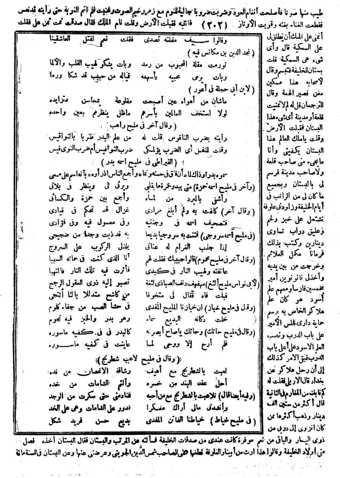 أطيب منها صوتا فأصلحت أنغام العود وضربت ضروباً جالبة للنوم مع زمر رخيم الصوت وغنيت فلم أتم النوبة حتى رأيته قد نعس فقطعت الغناء بغتة وقويت ضرب الأوتار فانتبه فقبلت الأرض وقلت نام الملك فقال صدقت نمت تمنَّ علي فقلت أتمنى على الملك أن يطلق لي على السمكية قال وأي شيء هي السمكية قلت بستان للخليفة فتبسم وقال لأصحابه هذا مسكين مغن قصير الهمة وقال للترجمان قل له لم لا تمنيت قلعة أو ومدينة أي شيء هذا البستان فقبلت الأرض وقلت يا ملك العالم هذا البستان يكفيني وأنا ما يجيىء مني صاحب قلعة ولا صاحب مدينة فرسم لي بالبستان وبجميع ما كان لي من الراتب في أيام الخليفة وزادني علوفة تشتمل على خبز ولحم وعليق دواب تساوي دينارين وكتب بذلك فرماناً مكمل العلائم وخرجت من بين يديه وأخذ لي نانو نوين أميراً بخمسين فارساً ومعهم علم أسود هو كان علم هلاكو الخاص به برسم حماية داري فجلس الأمير على باب الدرب ونصب العلم الأسود على أعلى باب الدرب فبقي الأمر كذلك إلى أن رحل هلاكو عن بغداد قال الأربلي فقلت له كم نابك من المغارم في الثانية قال أكثر من ستين ألف دينار وذهب أكثرها مما كان انزوى إلى دربي من ذوي اليسار والباقي من نعم موفرة كانت عندي من صدقات الخليفة فسألته عن المرتب والبستان فقال البستان أخذه مني أولاد الخليفة وقالو هذا إرث من أبينا والعلوفة قطعها عني الصاحب شمس الدين ألجويني وعوضني عنها وعن البستان في السنة مائة